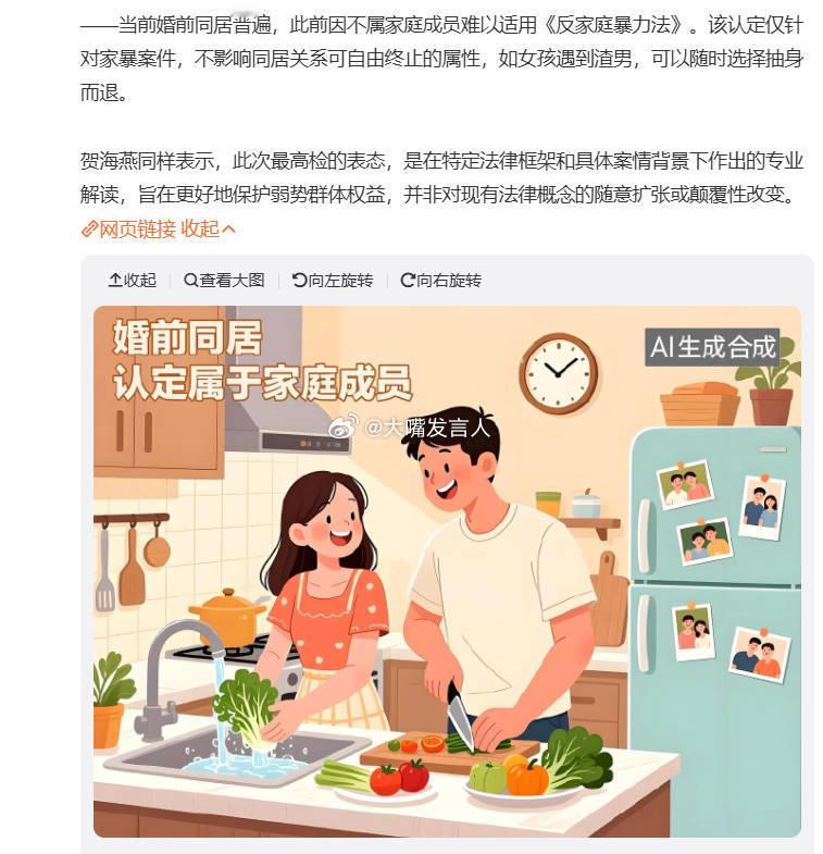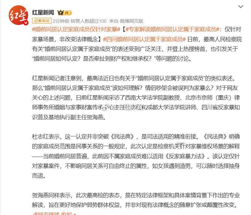 四问婚前同居认定属于家庭成员 最高检给出的解释,叫“司法解释”,司法解释和立法解释是有法律效力的。你们媒体有疑问,看到舆论有疑问,你们不直接采访最高检,你们媒体采访学者、律师,学者律师给出的理解、解释,叫“学理解释”,效力等于个气。婚前同居认定家庭成员仅针对家暴,专家解读婚前同居认定属于家庭成员,婚前同居认定属于家庭成员 ,同居 重婚 ,热点观点