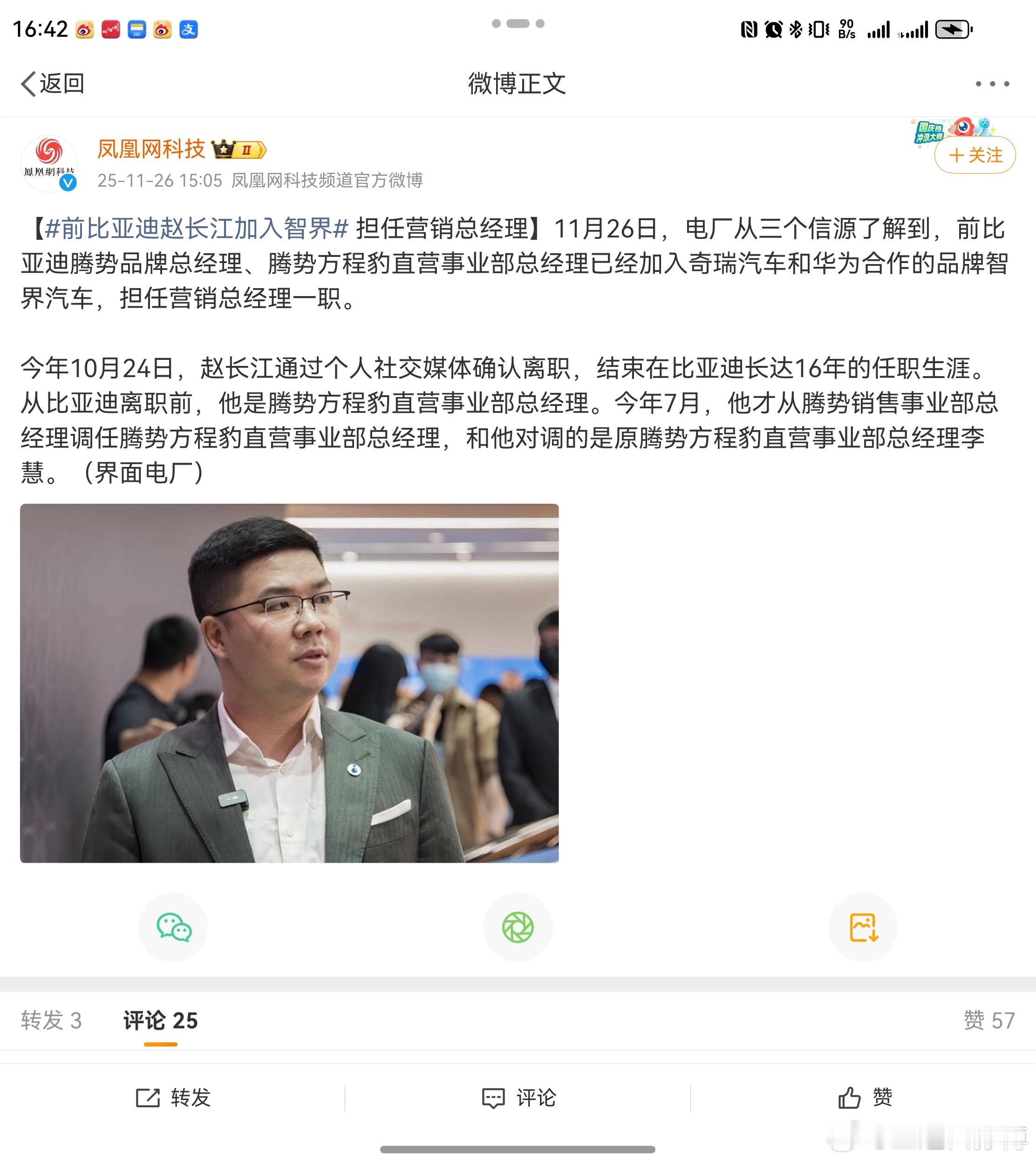 今天汽车圈两则重磅的人事动向。关海涛关总回归荣耀,赵长江则去了智界。。。长江的去向,估计会让之前吹腾势吹的比较离谱的几个死忠粉比较拧巴。前比亚迪赵长江加入智界原极氪关海涛回归荣耀
