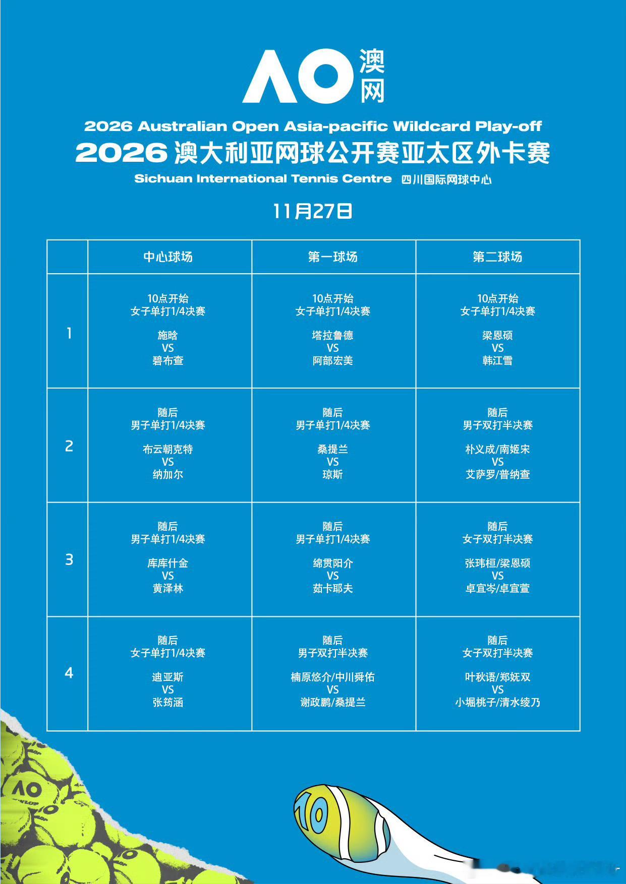 澳网2026 亚太区外卡赛11月27日赛程🇨🇳施晗、🇨🇳布云朝克特、🇨🇳张筠晗亮相中心场加油啊各位!!!网球talking大会 丨中国网球