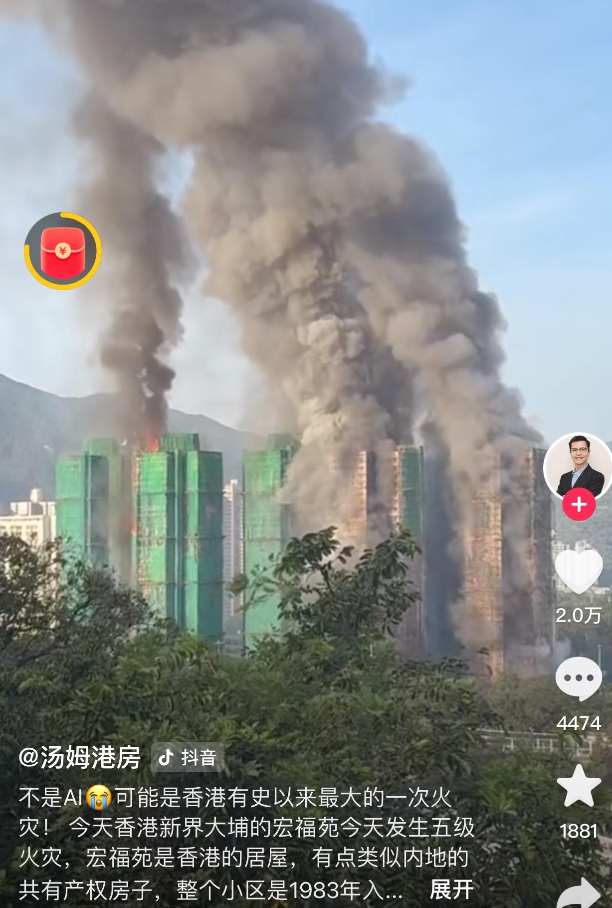 香港大埔大火隔着屏幕都让人心痛 目前火灾造成至少36人遇难,279人失联。 8栋楼一下子就全烧了 四十年的老房子 集资3.3亿想让家更漂亮更牢固 没想到被大火吞噬 几千人都得在外面过夜 还有很多人没跑出来 在外面的家属急得直哭 30层的高楼消防也够不到 只能先灭底层的火 现在能确定是大火从靠近海边的一栋大楼外墙的手脚架开始 然后火借风势点燃其他领近大楼 有些家里从阳台开始往里烧 这个损失不可谓不大