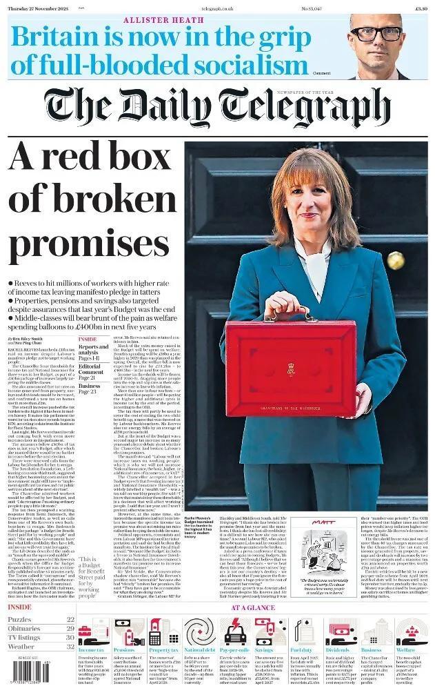 《每日电讯报》批评英国政府预算案,称其为一只充满破碎承诺的“红箱子”。该报声称,英国中产阶级将承受新税收措施的主要负担,并关注不断上升的福利成本。 2025年11月26日,英国政府2025年秋季预算案由财政大臣蕾切尔·里夫斯于公布,重点目标:增税,削减福利,同时扩大公共服务投资。
