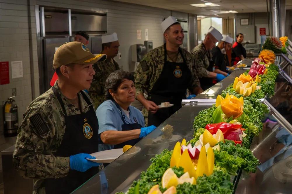“白人饭”无法跟中餐相提并论,一点也没有胃口。 2025年11月25日,在美国圣地亚哥海军基地举行的感恩节特别餐中提供各种热食。圣地亚哥海军基地是50多艘舰船的驻地,同时也是太平洋舰队的主要母港。