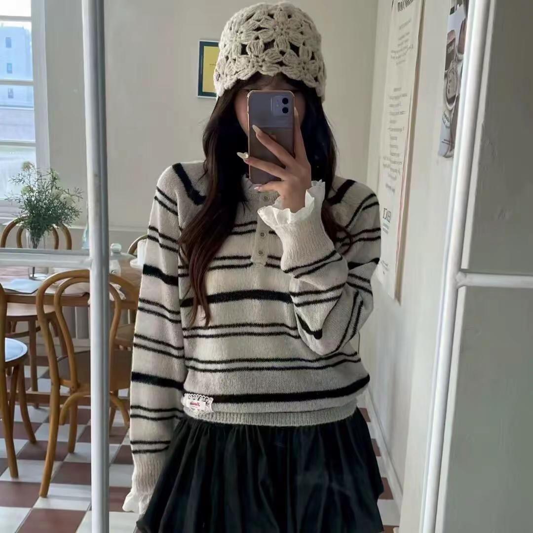 甜美风穿搭条纹翻领蕾丝花边袖口针织衫藏青色褶皱裙韩系穿搭...
