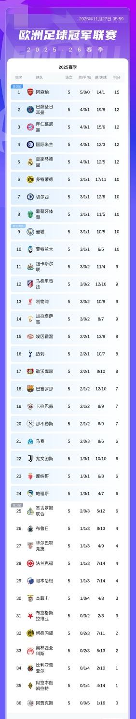 欧冠积分榜:阿森纳积15分领跑,巴黎拜仁国米皇马均积12分分列2-5名 11月27日 欧冠第5轮战罢 阿森纳3-1力克拜仁 国米1-2不敌马竞 利物浦1-4埃因霍温 皇马客场4-3战胜奥林匹亚科斯 巴黎5-3热刺 葡体3-0布鲁日 亚特兰大3-0法兰克福 摩纳哥2-2帕福斯 积分榜上: 阿森纳全胜积15分领跑,巴黎、拜仁、国米、皇马同积12分分列2-5名,切尔西积10分第7,曼城积10分第9,利物浦积9分第13,巴萨积7分第18