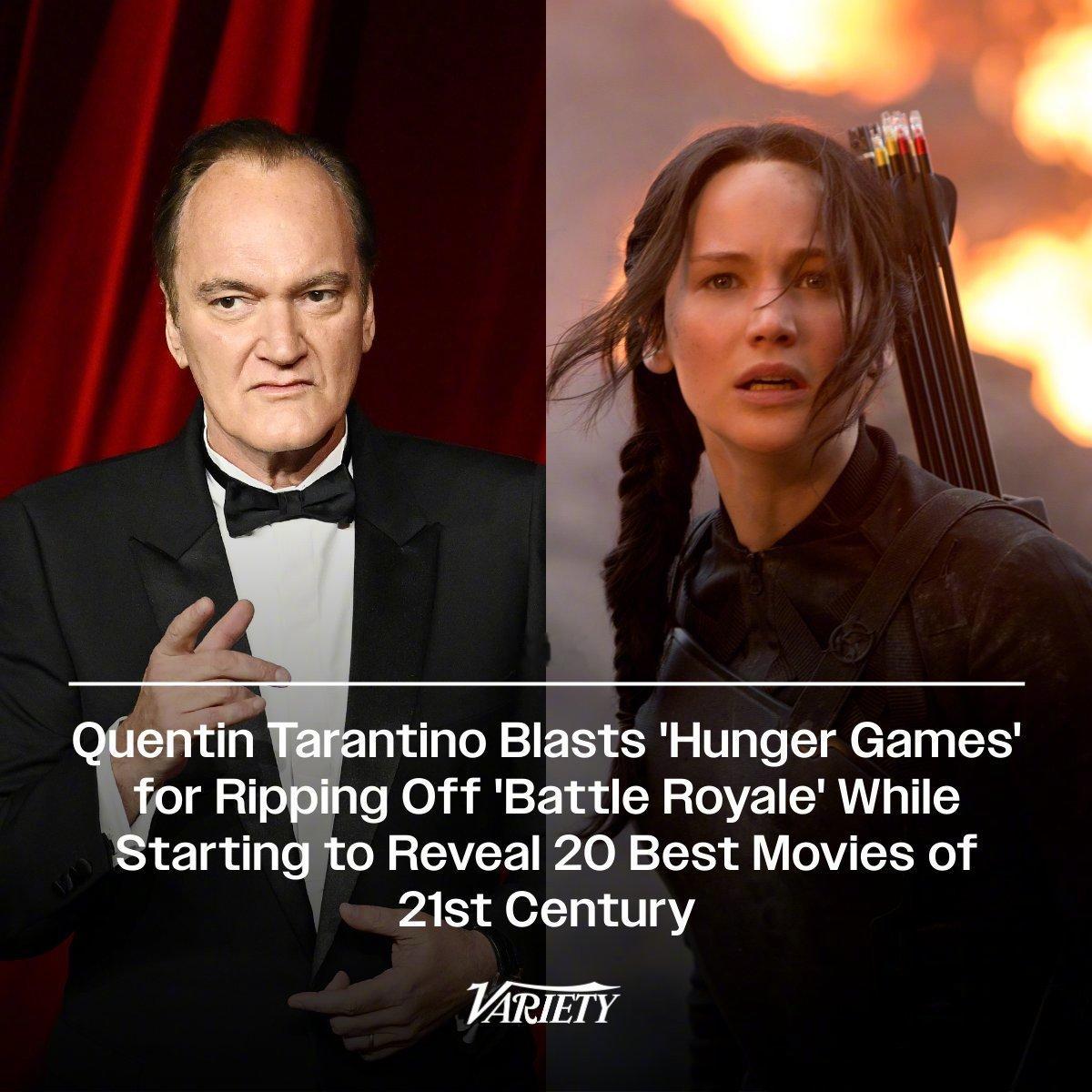 昆汀在最近一档播客节目中公布了其个人评出的21世纪迄今为止20部最佳电影片单后10名:11. 《大逃杀》导演 深作欣二12. 《大坏狼》导演 亚伦·凯莎莱斯 / 纳沃特·帕普莎多13. 《蠢蛋搞怪秀》导演 杰夫·特雷梅因14. 《摇滚校园》导演 理查德·林克莱特15. 《耶稣受难记》导演 梅尔·吉布森16. 《千尸屋2》导演 罗布· 赞比17. 《女拳霸》导演 普拉奇亚·平克尧18. 《点球成金》导演 贝尼特·米勒19. 《尸骨无存》导演 伊莱·罗斯20. 《西城故事》导演 史蒂文·斯皮尔伯格在播客中,昆汀还抨击《饥饿游戏》抄袭了《大逃杀》。《饥饿游戏》小说为作家苏珊·柯林所著,后被改编成电影。“我真不明白那个日本作家为什么不把苏珊·柯林斯告到倾家荡产,他们根本就是照搬了那本书!那些愚蠢的书评人不会去看一部叫《大逃杀》的日本电影,所以他们从来没有揭穿她。他们居然谈论说这是他们读过的最原创的东西。而影评人一看到那部电影就说,‘搞毛啊!这不就是PG-13版《大逃杀》嘛!’”昆汀还透露,他是最早看到《大逃杀》的人之一,因为他是导演深作欣二的朋友。当时昆汀正在日本为《杀死比尔》做前期采景,深作欣二邀请他参加一个私人放映会,观看他一直在制作的那部电影。“我完全不知道自己接下来会看到什么,然后,我滴老天爷!我甚至不知道我看了什么。太狂野了……三个月后,我在西雅图电影节。他们将在午夜场放映《大逃杀》。那时美国还没人看过这片子。我去了那个午夜场,那是我经历过最激动人心的放映之一,我等着电影开始。我知道他们将看到什么。这部电影带给他们的会超出他们的想象!他们根本没准备好迎接这部电影会带来的冲击。拥有那种知晓一切的感觉,就是一种力量。”昆汀将在下一期播客中公布他个人评出的21世纪最佳电影前10名。昆汀饥饿游戏