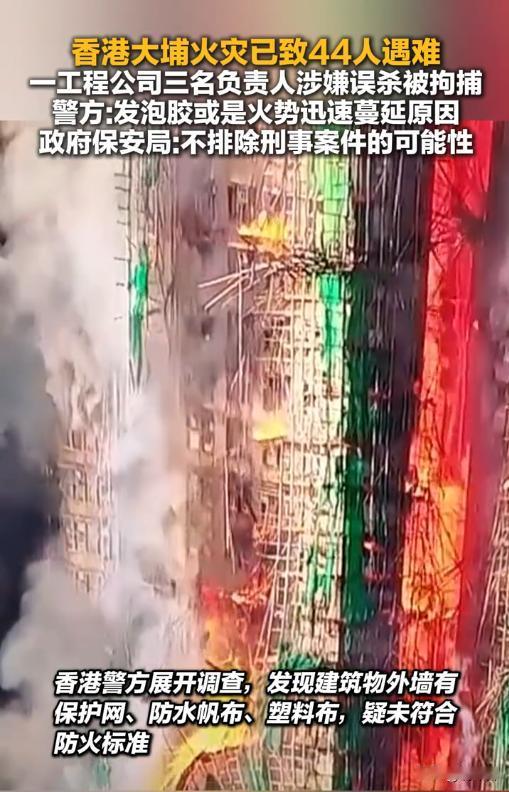 🔥香港大埔火灾40死45伤!警方以误杀罪拘捕3人,中联办发声致哀 揪心!香港大埔宏福苑的这场五级火警,让无数人彻夜难眠。截至11月27日,火灾已造成40人遇难、45人受伤的惨痛后果,其中还包括一名在救援中殉职的37岁消防员,生命的逝去令人无比痛心🙏 事件有了关键进展:27日香港警方正式宣布,以涉嫌"误杀罪"拘捕了负责大厦维修工程的"宏业建筑工程有限公司"3名负责人,包括2名公司董事和1名工程顾问,年龄在52至68岁之间。警方调查发现,大厦外墙使用的保护网、防水帆布及电梯大堂外的发泡胶等材料,疑似未符合防火标准,这些易燃材料极有可能是导致火势迅速蔓延的重要原因。 时间线清晰梳理:11月26日下午,宏福苑突发五级火警,滚滚浓烟迅速笼罩整栋楼宇。消防人员第一时间赶赴现场展开救援,经过连夜奋战,目前现场火情已基本受控。特区行政长官李家超在火灾发生后立即主持跨部门紧急会议,启动紧急事故监察及支援中心,明确"扑灭火情、救助伤者"为首要任务,并要求各部门全力协助受影响居民。 目前,特区政府已在现场设立援助站,安排受灾居民入住临时庇护中心,民政及福利部门正为死伤者家属提供援助和情绪支援;医管局也启动应急机制,调动最优医疗资源救治伤者。针对涉事的维修工程,香港房屋局表示将由独立审查组依据《建筑物条例》展开深入调查,若发现违规将依法严肃追责。 中央政府驻港联络办(中联办)也迅速发声,对火灾中的遇难者表示沉痛哀悼,向死者家属和受伤人员致以深切慰问,并明确表示,如特区政府有任何需要,将随时提供一切必要协助,用实际行动传递中央对香港市民的关怀。 一场火灾,牵动两地心。愿逝者安息,伤者早日康复。后续的事故原因调查与责任追究,我们将持续关注! 香港中联办就火灾发声 香港警方以涉嫌误杀罪拘捕3人 香港火灾已致40死45伤 香港大埔火灾最新进展