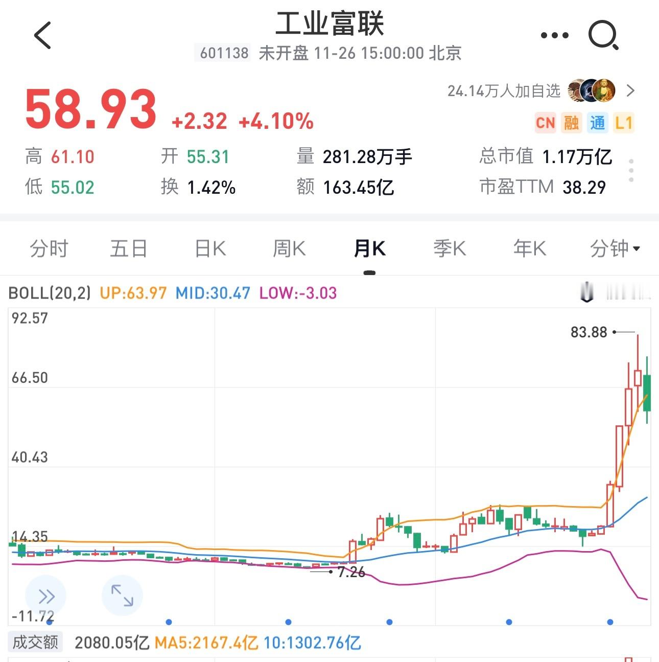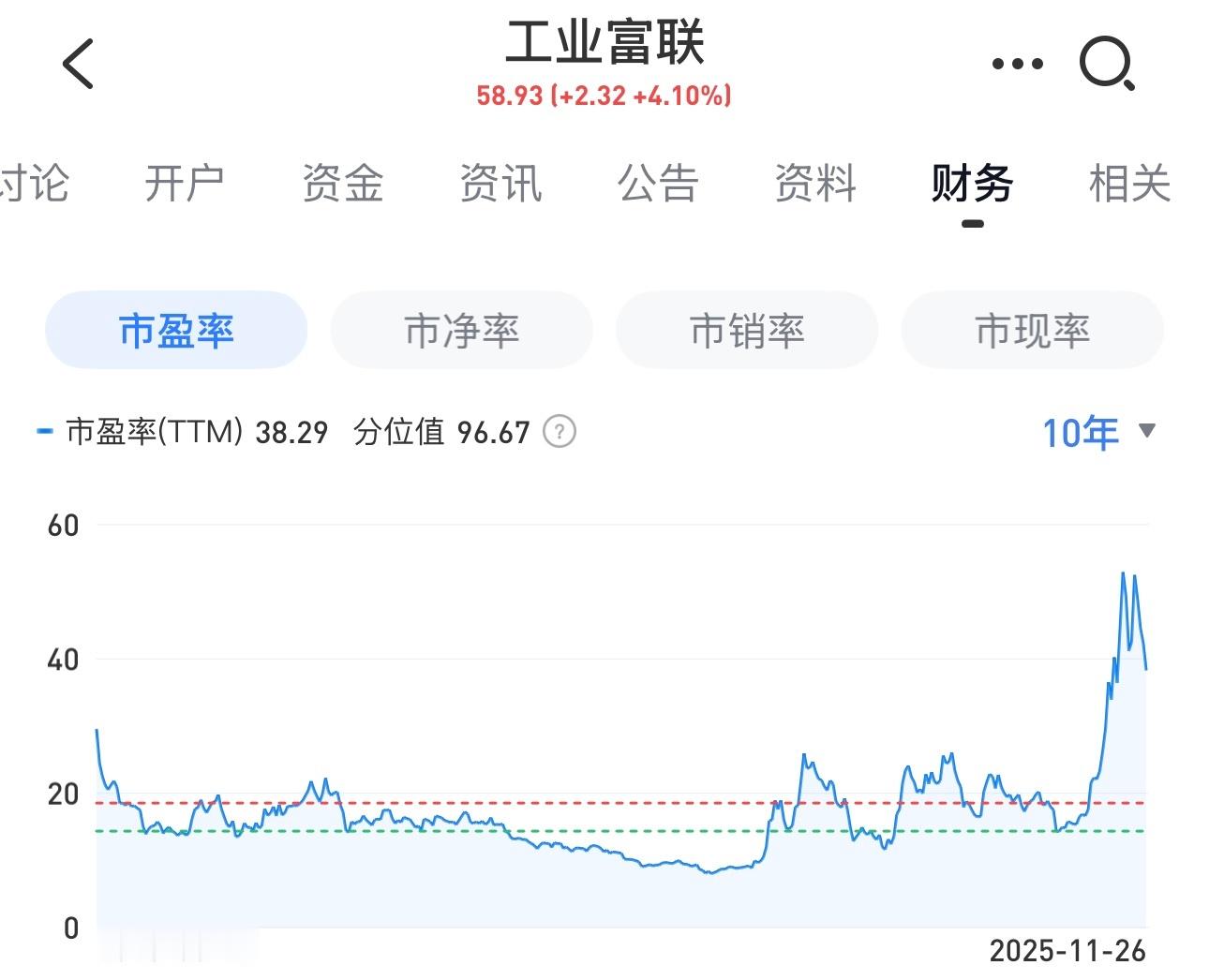 工业富联股价涨的好,确实业绩也增长了,但主要还是估值的提升。请看图二,工业富联2018年上市至今,长期市盈率是低于20倍的,很长一段时间市盈率更是低于10倍以下,就是2025年4月市盈率还15倍左右。股价一度涨到83块,当时市盈率高达52倍。现在动态市盈率38倍。股价从底部起来涨了好几倍,主要是2022年市盈率最低时8倍左右。未来如果再给10倍-15倍市盈率区间,现在股价贵还是便宜呢。