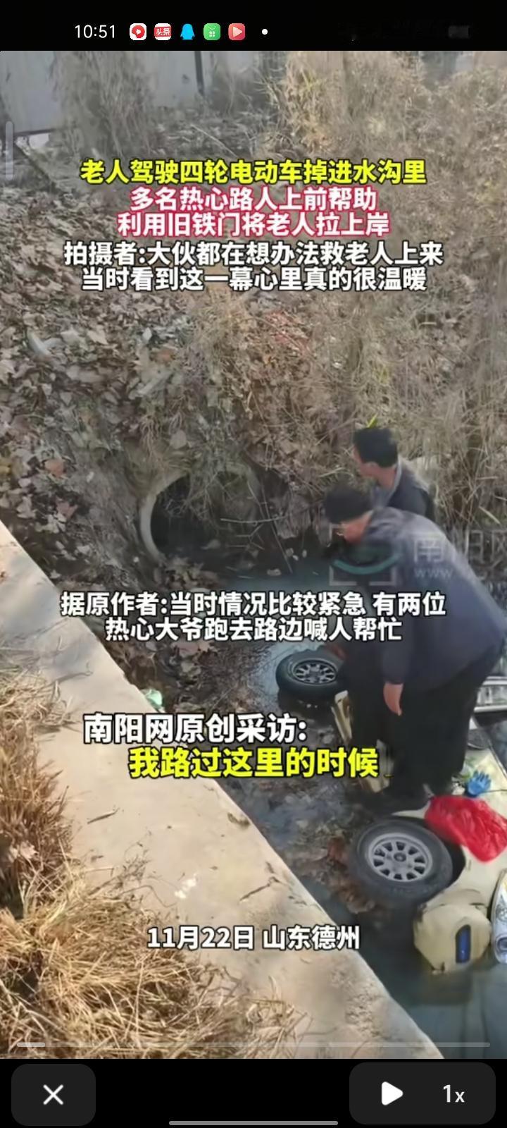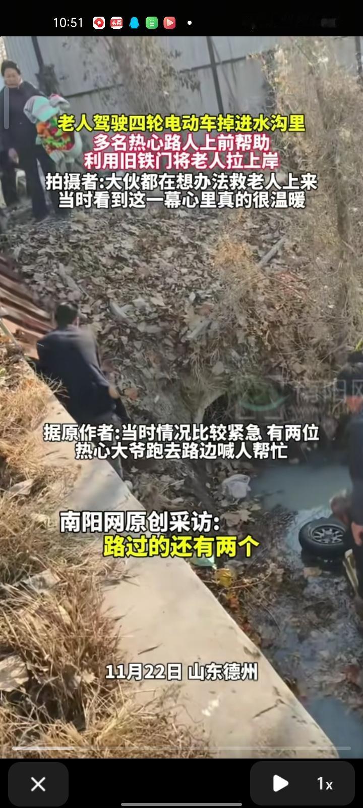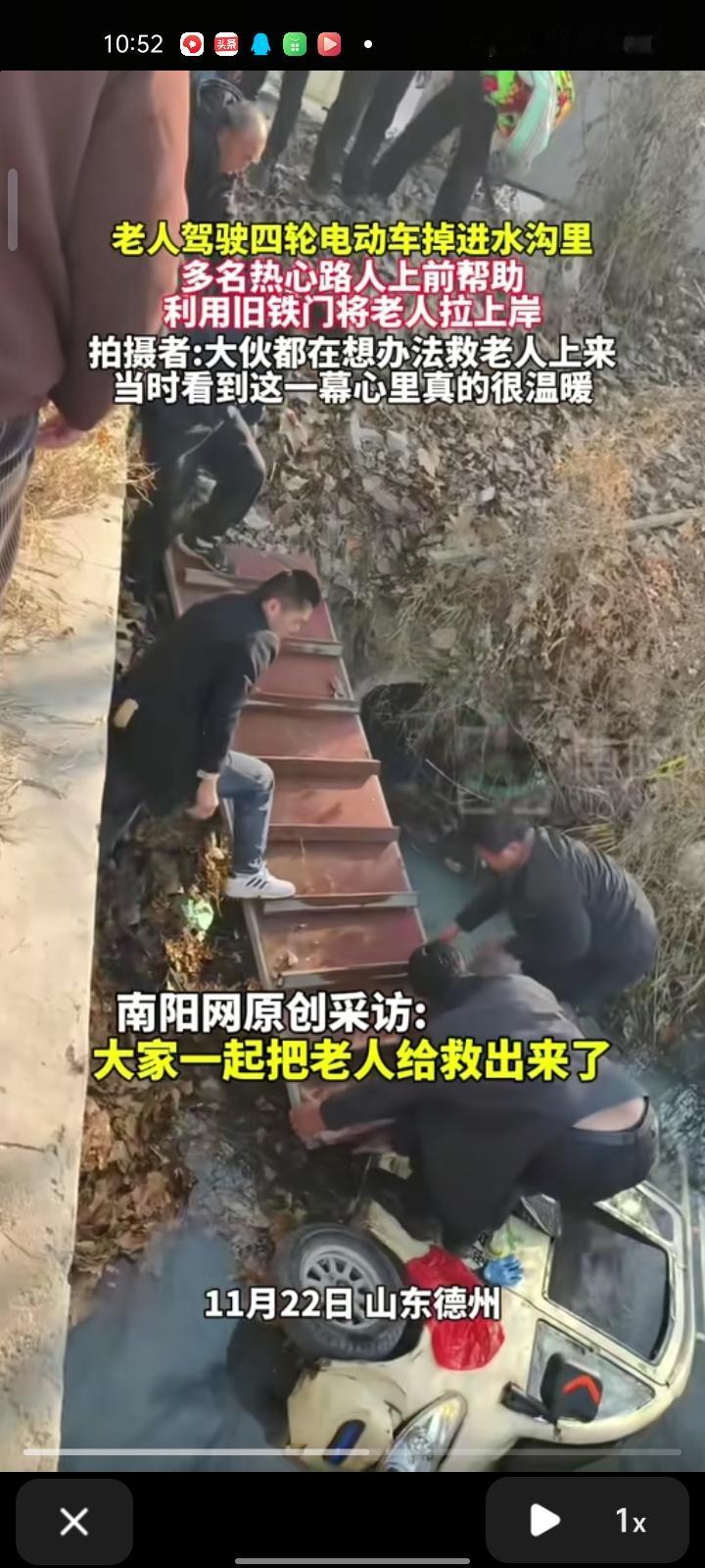 11月22日,德州市平原县。老人驾驶四轮电动车不慎掉水沟里,多位热心路人上前帮助,去附近的工厂借了旧铁门,铁门放在水沟旁,把老人慢慢救上来了。
