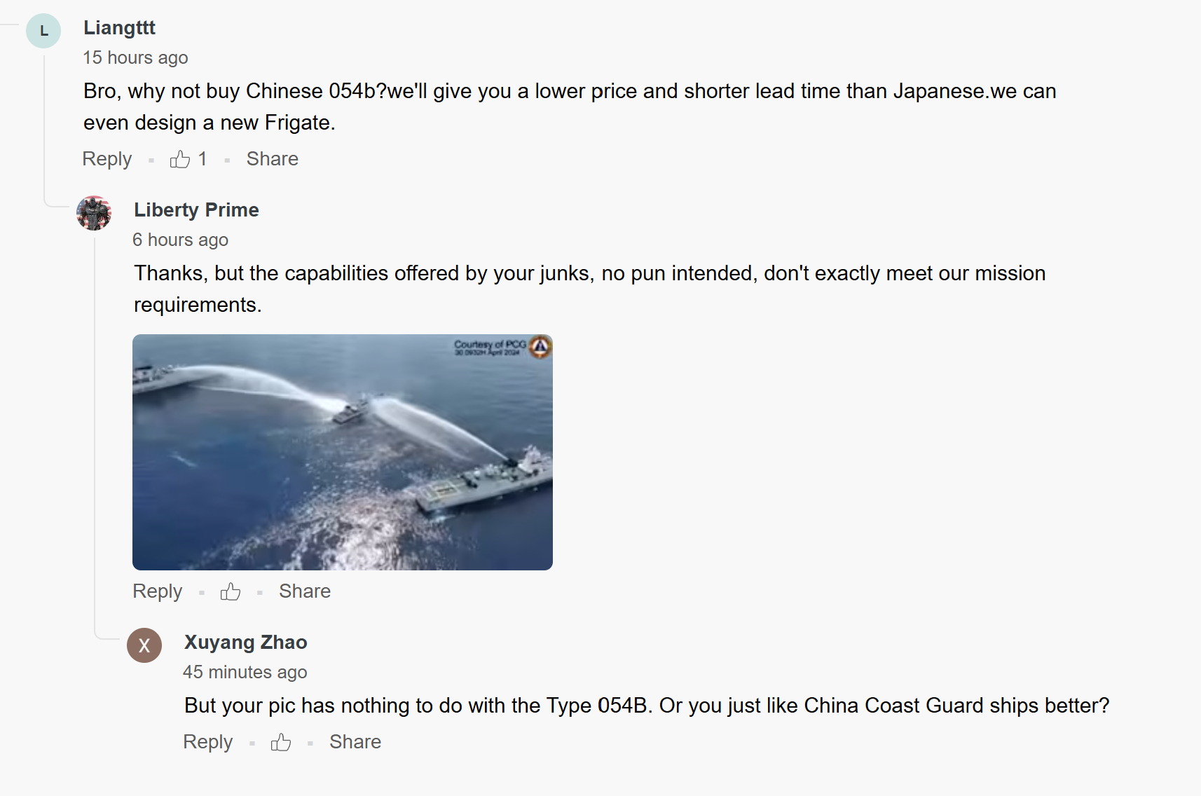 【不发机翻了,大家可以自己去机翻看看】7字头院里的卷王们辛辛苦苦干七八年干出来的优秀设计方案,被你转手就拿去资敌了是吧真以为能在红脖子那赚到面子吗?红脖子的最大特点不就是脑子里只有立场和sh*t吗,你看看人家会给你面子吗?会尊重你吗?会尊重我们国家的优秀工业产品吗?怎么面对红脖子?学学最下面那位老哥,他的打法才是比较正确的