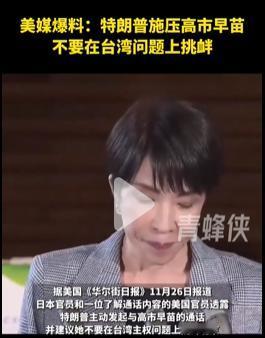 美媒爆料:特朗普施压高市早苗不要在台湾问题上挑衅!11月26日,《华尔街日报》称,日本官员和一位了解通话内容的美国官员透露,特朗普主动发起与高市早苗的通话,并建议她不要在台湾问题上挑衅。那么现在问题来了,特朗普与高市早苗的通话都已经过去两天了,高市早苗为什么还不撤回涉台错误言论?她是准备接受规劝未来“不再挑衅”而并不撤回此前的相关言论吗?她会在什么时候撤回错误言论?如果高市早苗一直不撤回错误言论,咱们该怎么办?