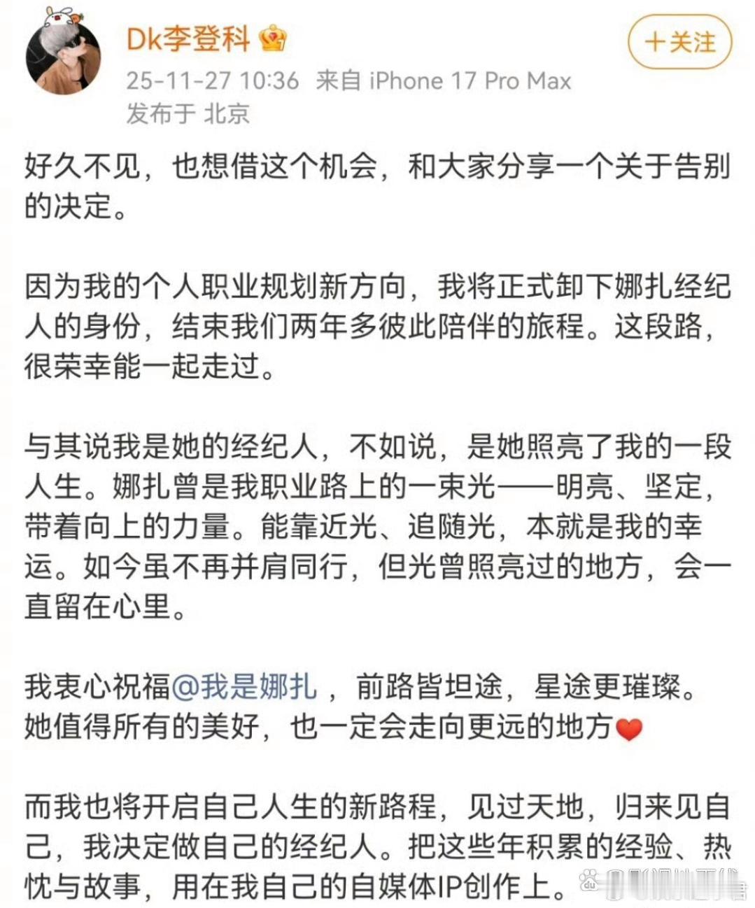 古力娜扎经纪人发文卸下娜扎经纪人的身份决定做自己的经纪人,用在自己的自媒体ip创 古力娜扎 自媒体 iPhone 17 Pro Max iPhone 17 Pro 当红女星 关我毛柿 2025-11-27
