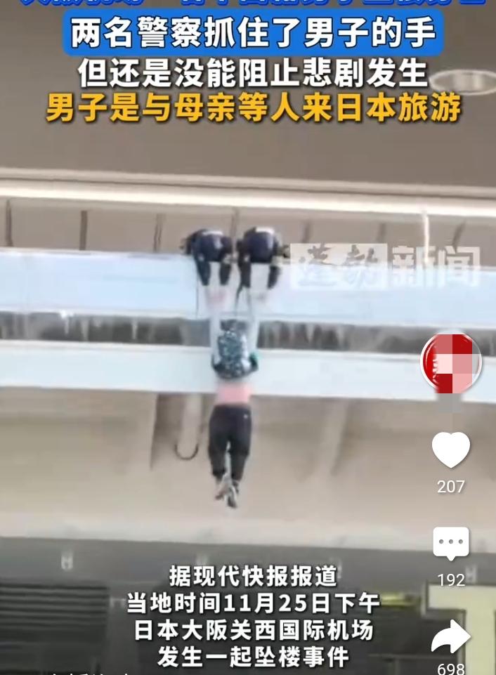 20多岁中国籍男子和母亲去日本大坂旅游在关西机场坠楼事件当时救援图片曝光,该男子非常悠闲的坐在机场护栏处喝着类似咖啡的饮料,两名日本执法人员也确实拉住了他的手,可不知何故突然失控导致男子坠楼事件。 他的母亲应该有一定的话语权,如果是母子发生争吵引发情绪问题这个概率很低,至于在救援过程中出现意外这个让事件扑朔迷离,从第一张图片来看他是有自救机会的,可为什么等救援人员来了以后会失手滑落,具体原因正在调查中。 不过可以肯定他本人具有不可推卸责任,去日本旅游的家庭一般经济条件毕竟好,从他的穿着和体形来看估计是失恋,当然这只是一种猜测,20几岁可以去日本旅游这样的家庭最起码属于中产阶级,那么他的行为可能涉及股票失败.恋爱受阻.又或者有轻微的抑郁症,只能说年轻人还是要珍惜自己,遇到问题三思而后行。