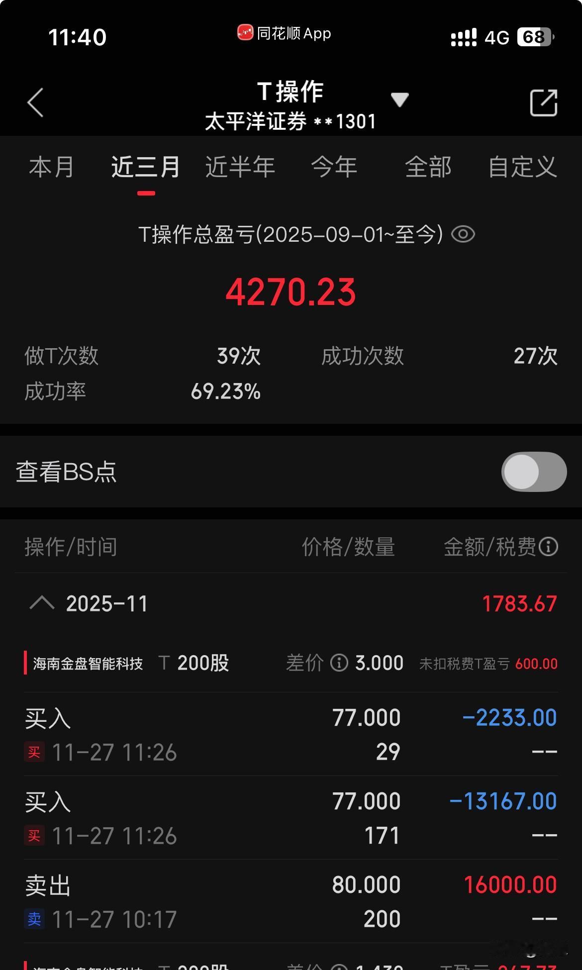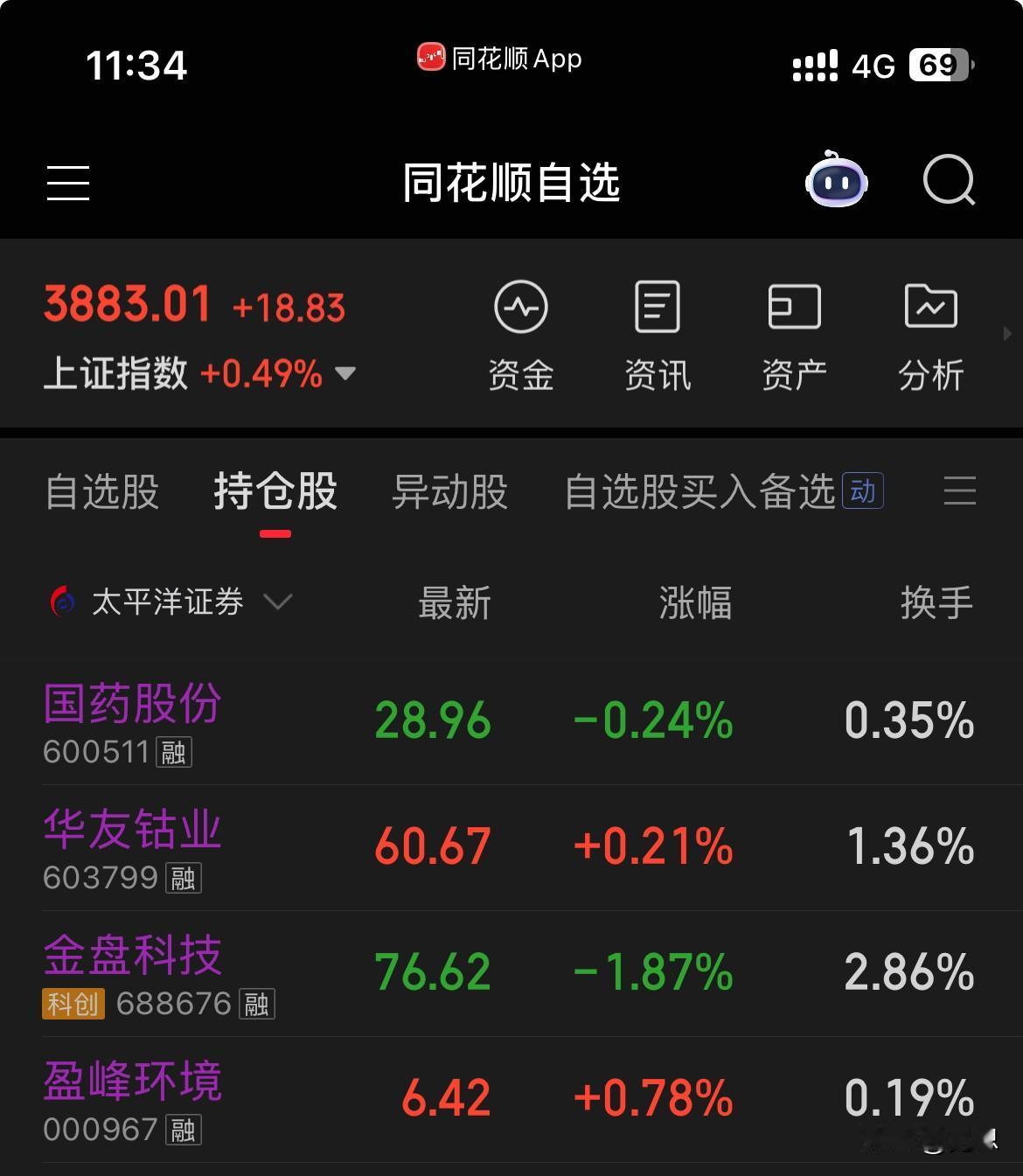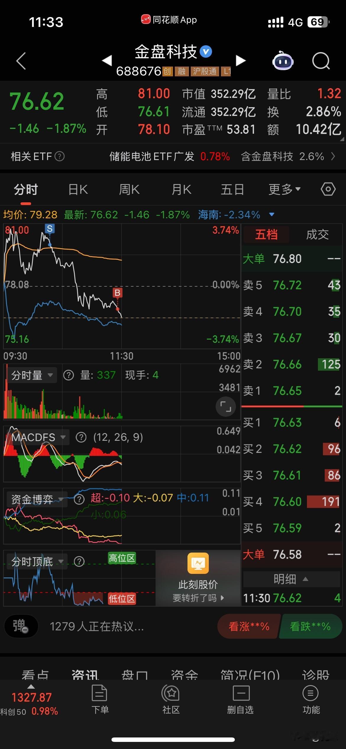 上午收盘了,大盘成交量11点后萎缩了,下午感觉凶多吉少。 今天东财账户通信ETF高点卖了,赚10个点。 同花顺这边金盘做了个T,赚600块左右。 77左右有护盘迹象,设的77元买入,还是买早了。盈峰6.42卖了1/3。 由于员工持股计划开启,感觉股价会有压制,可能不会开启上涨,还是准备高抛低吸等待来年[捂脸]。尾盘看机会加点华友。上午盈利5百多,3成不到仓位。