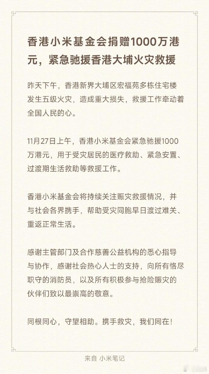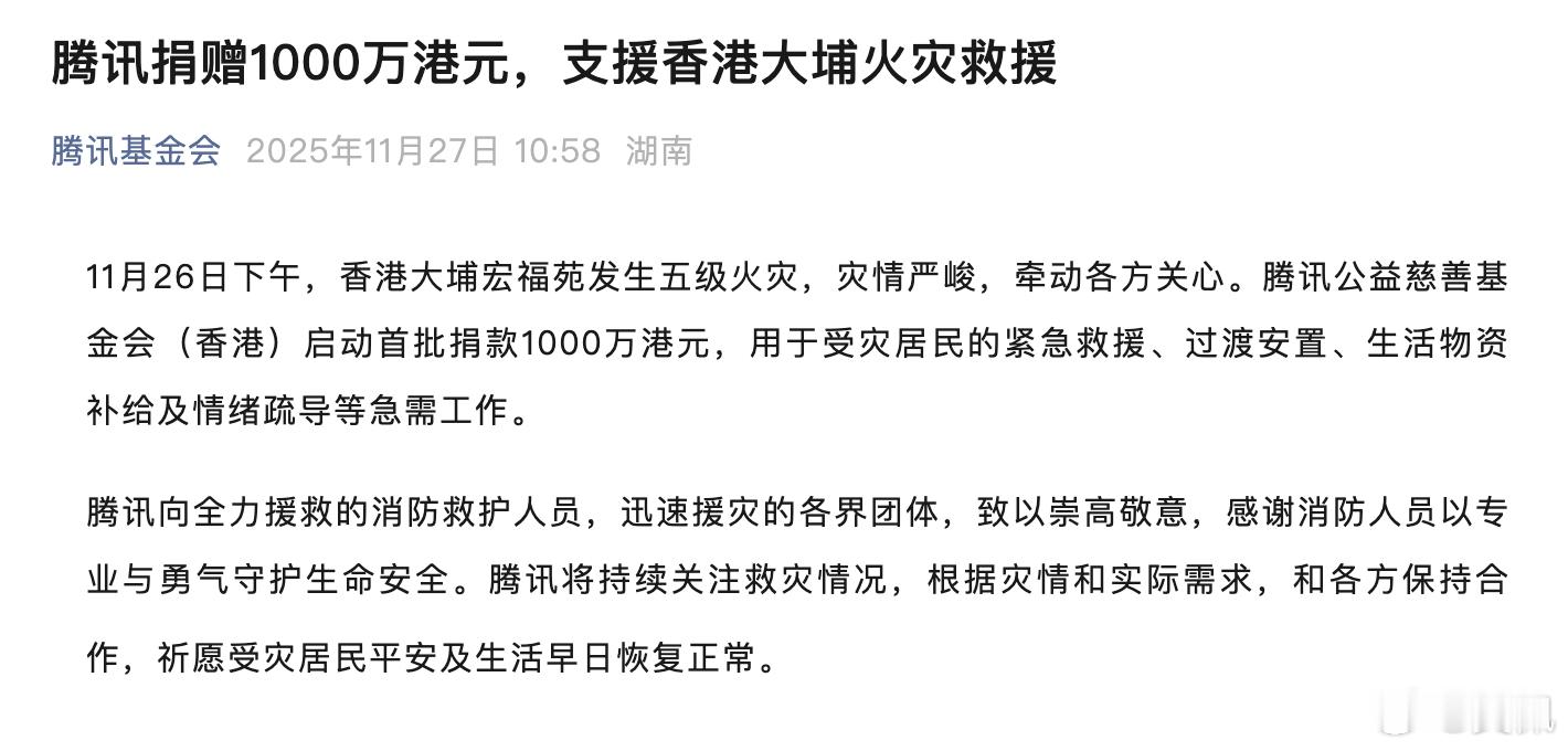 到目前为止,多家品牌或单位为香港火灾进行捐助🙏🏻🙏🏻中国红十字会:200万人民币安踏:1000万港币+价值 2000万港币物资361°:1500万港币腾讯:1000万港币小米:1000万港币香港火灾已致44人遇难香港火灾香港大埔火灾已基本控制