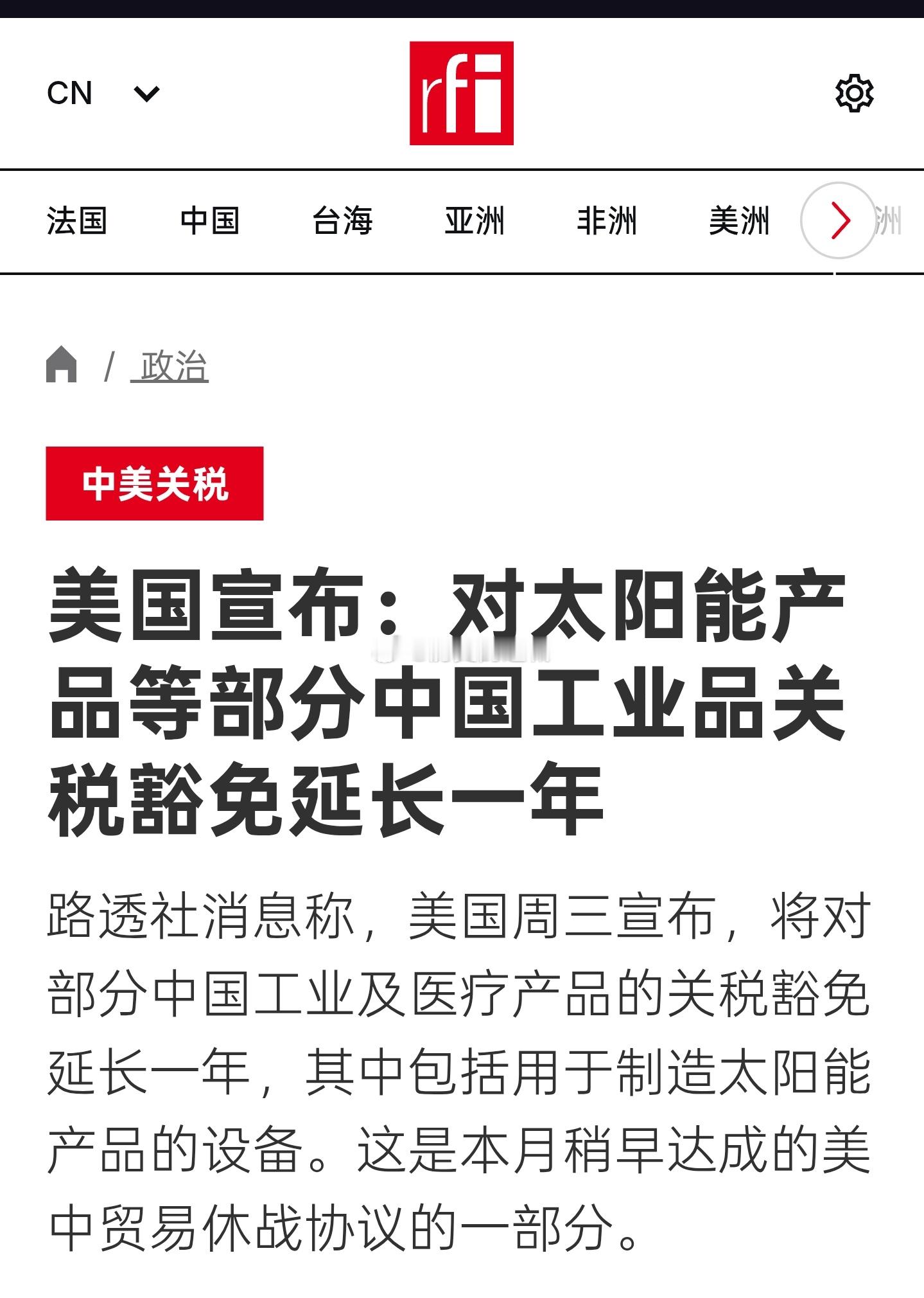 美国周三宣布,将对部分中国工业及医疗产品的关税豁免延长一年。此次措施涵盖 14类与制造太阳能产品相关的设备,以及164类各种工业和医疗产品,包括电动机、血压监测设备、泵组件、汽车空气压缩机及印刷电路板等。