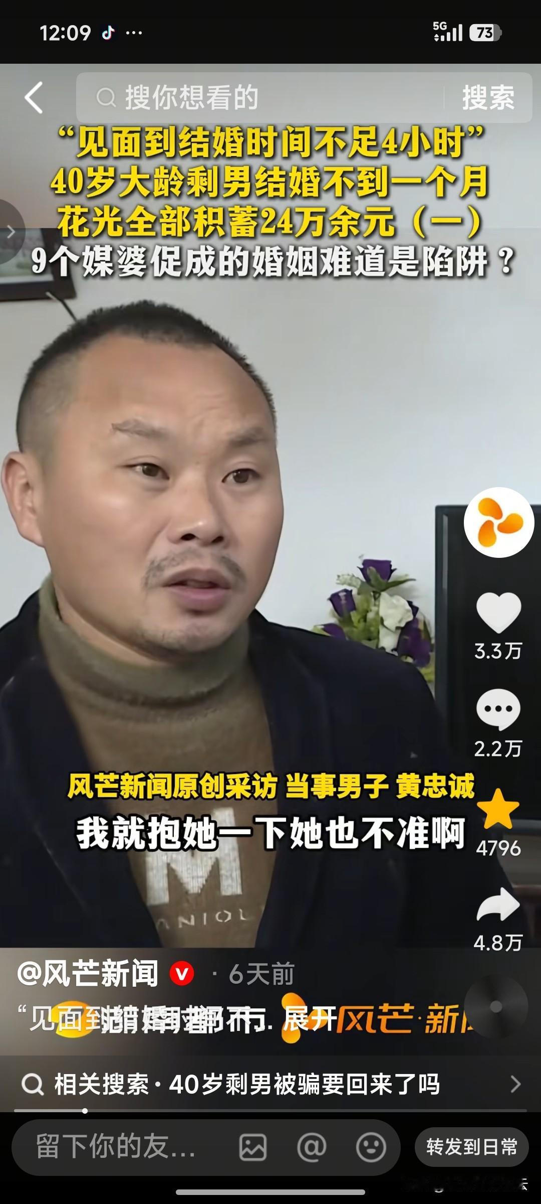这个男人我都替他冤的慌。湖南男子40岁还没结婚,通过媒人找了个离异带着女儿的相亲对象。没想到女方临时带了8个媒人和他相亲。 男子在对方的一阵忽悠下,当天就和女子领了结婚证。可结婚刚两天,妻子就撵着他去广东打工,之后的不到一个月里,开始以各种名义问他要钱。 看到男子拿不出钱了,妻子开始对他爱搭不理,还经常骂他。男子说,自己结婚一个月,和妻子在一起就两天,过过一次夫妻生活,却花光了他全部的积蓄24万。 男子要求女子还钱,女子还委屈上了,她说男子把她放抖音上,让她丢了面子。就算补偿她一个亿,她都不原谅男子。她让男子有本事去法院起诉她。 有网友说,女的很聪明,领了结婚证报警就没用了,成了民事纠纷,想要回钱就得打官司,很麻烦的。 对于这件事,你怎么看呢?
