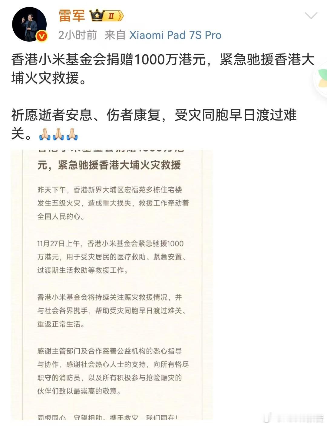 雷军回应小米基金会捐1000万港元11月27日,发文:香港小米基金会捐赠1000万港元,紧急驰援香港大埔火灾救援。祈愿逝者安息、伤者康复,受灾同胞早日渡过难关!香港小米基金会捐赠1000万港元小米股价再度走高小米