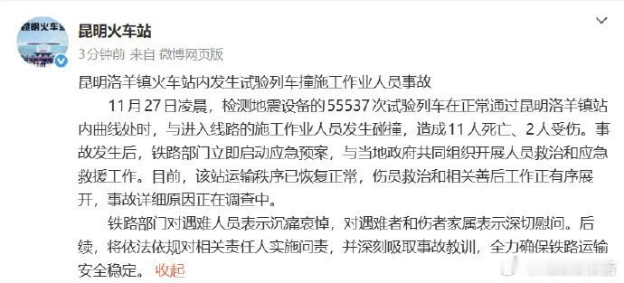 昆明一火车站试验列车撞人致11死昆明试验列车撞人致11死2伤令人痛心,愿逝者安息、伤者康复,盼彻查原因追责问责,严守铁路安全底线。