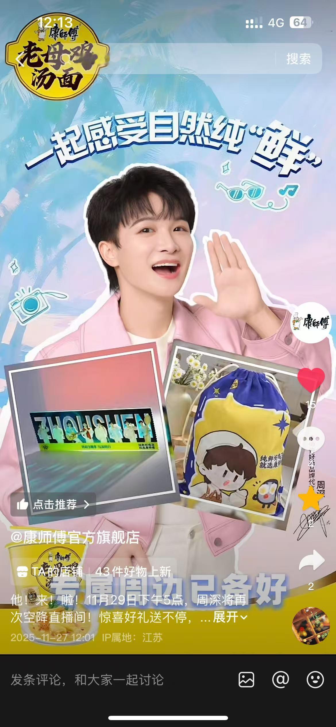 周深 📣 11.27 抖🎶 📣【康师傅官方旗舰店】的抖🎶更新米子们快来完整观看并多多三连互动安利