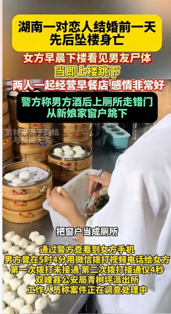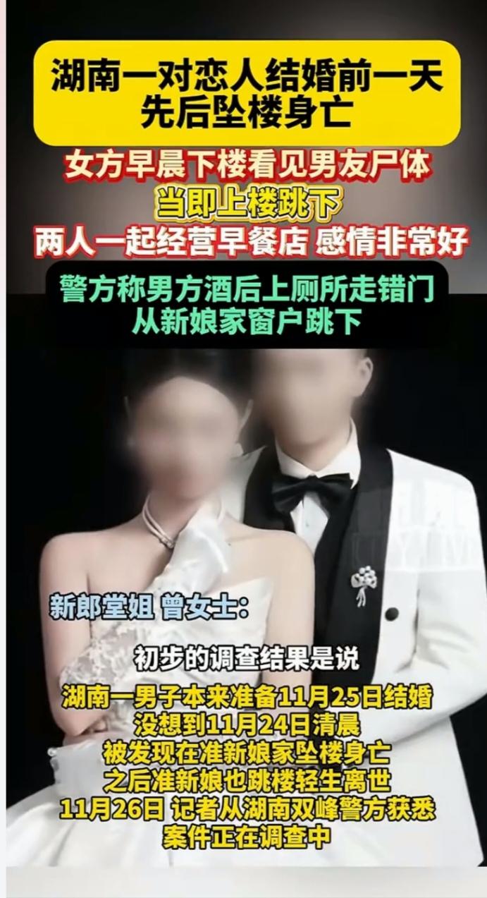 湖南准新郎新娘24小时内先后坠楼真相成谜 玻璃窗上大红喜字犹在,楼下血泊中却躺着两位新人冰冷的身体。 原本计划11月25日举办婚礼的湖南25岁男子曾中阳,11月24日清晨在准新娘家坠楼身亡。紧接着,目睹男友尸体的准新娘在短短几小时内从同一栋楼的四楼跳下,因伤势太重不幸离世。 这对相爱六年的恋人,就这样在婚礼前一天双双殒命,留给亲友无尽的悲痛与疑团。 01 喜庆婚礼前的突发悲剧 这场突如其来的悲剧发生在湖南省双峰县青树坪镇。11月23日晚上,曾中阳和女友与朋友们聚餐喝酒,一直持续到24日凌晨2点才结束。 之后,两人一起回到了青树坪镇的女方家中。 准新娘的堂姐曾女士透露,监控显示曾中阳下车时走路平稳,并没有明显醉酒迹象。 然而,凌晨5点04分,曾中阳却用微信给女友拨打了视频电话。第一次未接通,第二次拨打接通仅4秒便被挂断。 02 关键时间线的疑点 24日清晨6点26分,曾中阳被发现在女方家楼下坠亡。 据曾女士叙述,女方的父亲是第一个发现曾中阳坠楼的人,但令人不解的是,直到7点10分才报警,相隔约半小时。 更让人困惑的是,准新娘在7点40分才被母亲叫醒下楼。当她看到男友的尸体后,当即冲上四楼纵身跃下。 曾女士对此提出质疑:“女方父亲作为第一目击者,为什么时隔30分钟才报警?坠楼事件发生后,为什么作为妻子,在7点10分才被告知?” 03 家属对警方结论的质疑 双峰县青树坪派出所初步调查认为,曾中阳系“酒后上厕所走错门,将窗户误认为厕所而坠楼”。 但这一说法遭到曾中阳家人的强烈反对。 曾女士提出了几点关键质疑:首先,窗户离地有一米多高,且需跨过卧室与阳台的门槛,醉酒者误坠的可能性极低。 其次,两人感情深厚,男方家庭条件优越,有车有房,没有银行贷款,彩礼已在23日送到女方家,不存在经济压力。 04 不寻常的视频通话 凌晨5点04分的视频通话成为本案另一个谜团。 曾女士困惑地表示:“这个时间怎么解释?中间发生了什么?明明睡在一起,为什么要打电话?” 根据女方手机显示,曾中阳在5点04分用微信给女友拨打视频电话。第一次未接通,第二次拨打接通仅4秒。 这通短暂的通话内容成为解开谜团的关键之一。 05 网络传言与家属回应 悲剧发生后,网络上出现了各种猜测和传言。 有人猜测可能与彩礼纠纷有关,但曾女士否认了这种说法,表示“真的要加个3-5万彩礼,完全不是问题”。 她还透露,女方的父亲有不良嗜好和暴力倾向,但这一说法尚未得到警方证实。 曾女士强调,目前家人唯一的诉求就是查明真相,让弟弟走得明白。 06 警方调查与社会反响 青树坪镇政府工作人员表示,事发后多部门已到场处置。警方正在对事件详细经过进行全面核实。 这起事件在社交媒体上引发广泛关注,“恋人结婚前一天先后坠亡”话题阅读量巨大。 网友评论呈现两极分化,有人觉得“4秒通话太诡异”,也有人呼吁“在调查结果出来前,应避免网络断案”。 据事发地居民透露,原本喜庆的庭院现在一片肃穆,双方家属每日以泪洗面。曾中阳的家人24小时守在他身边,83岁的奶奶至今仍被瞒着消息,家人担心她承受不住这白发人送黑发人的痛楚。 警方专案组正全力调查,调取周边监控、提取生物痕迹、走访目击者,试图还原这两个年轻生命在最后一刻的经历。