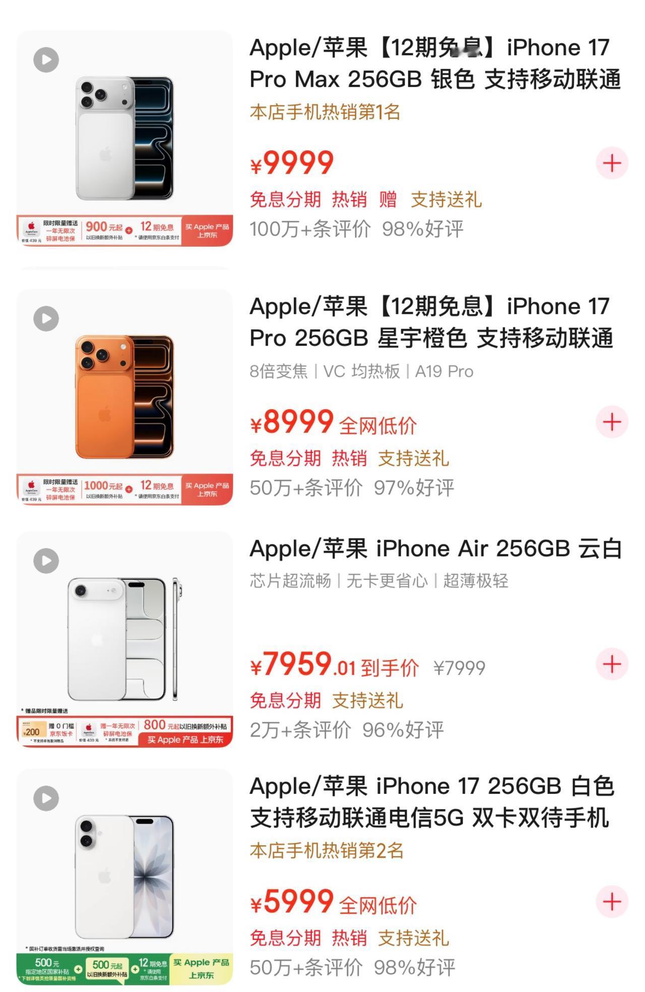 发布至今两个多月,京东iPhone 17系列评价数据: iPhone 17:50万条以上 iPhone Air:2万条以上 iPhone 17 Pro:50万条以上 iPhone 17 Pro Max:100万条以上