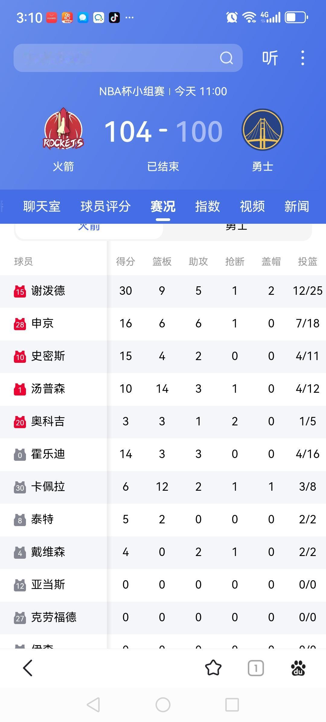 谢沷德拿下职业生涯最高30分,库里状态低迷,火箭客场104:100逆转勇士。 杜兰特缺阵。谢泼德首发,成为火箭得分的利器。三分有,中投有,突破有。无所不能的谢沷德真是令人刮目相看。火箭在落后的情况下,正是他带领球队一波反攻,到第3节结束,只落后勇士2分。到了关键的第4节,谢沷德依然毫不手软,凭借火箭众将齐心协力,最终客场逆转勇士。 谢泼德全场贡献了30分9篮板5助攻1抢断2盖帽,令人惊叹。