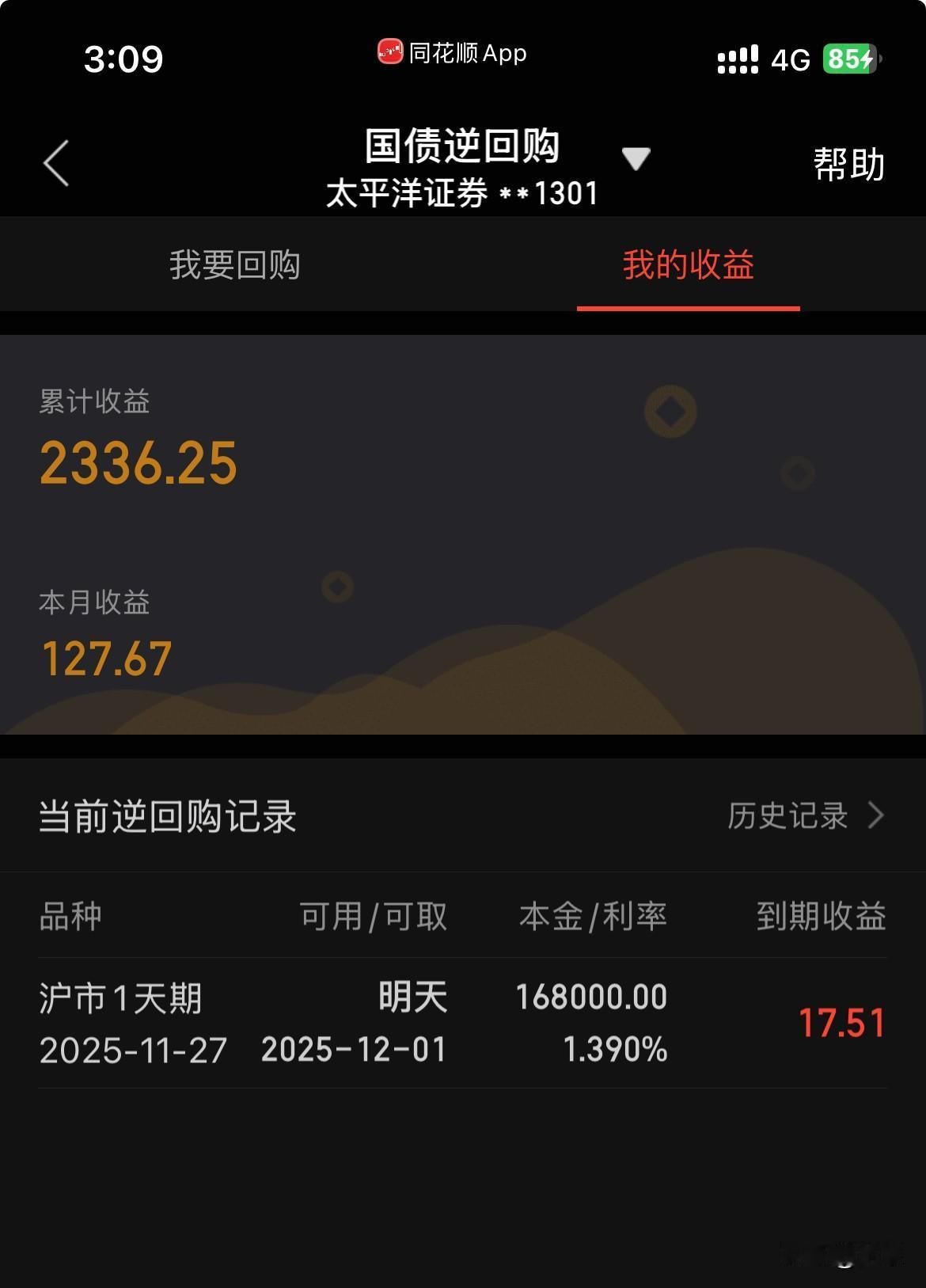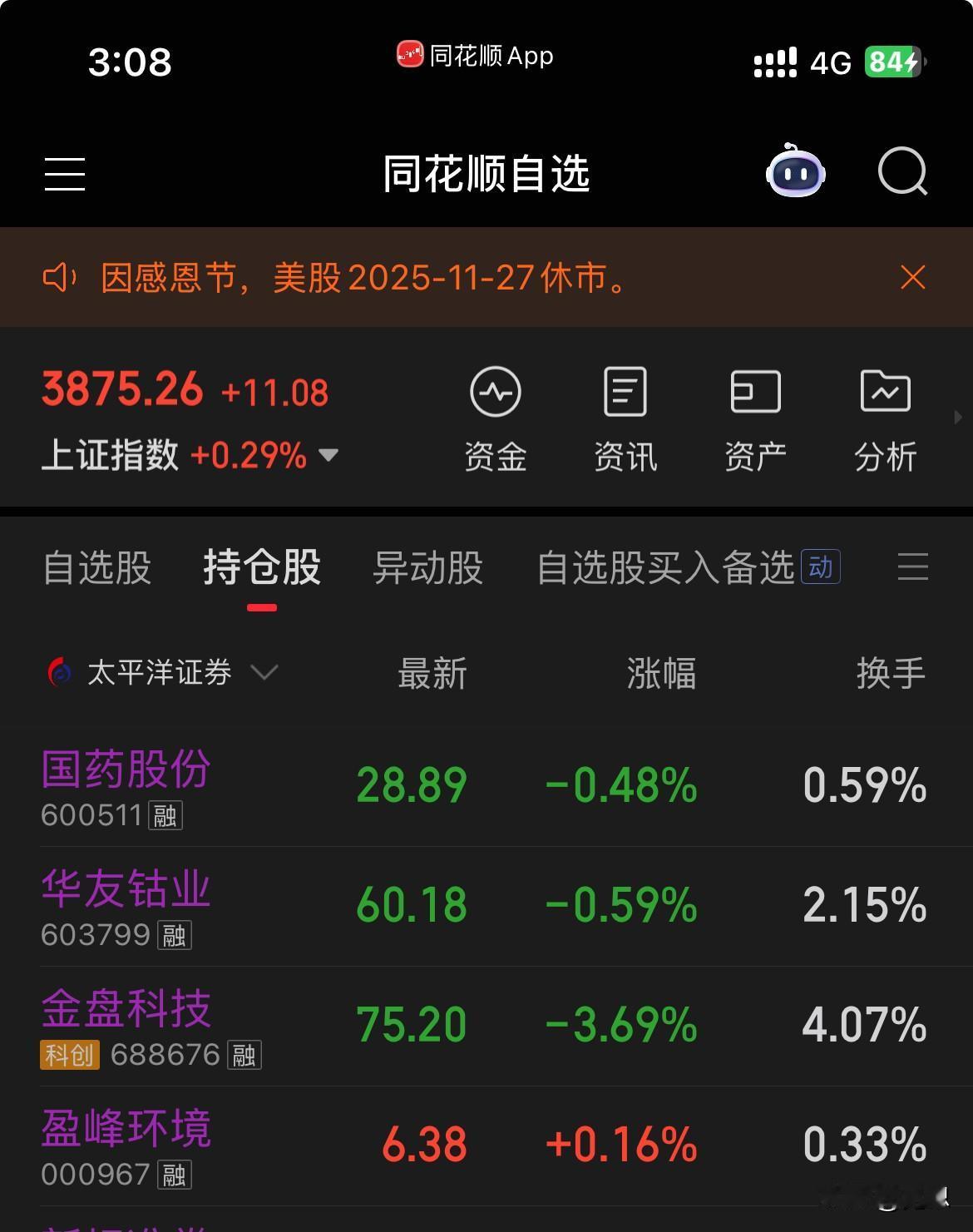 收盘了,如上午我所说下午大盘不容乐观,果然1点半后逐步下落直到尾盘。我没有坚持上午的计划,尾盘看情况补仓或买入。盘中手急补了华友和拣回金盘。随着股价的慢慢下跌。利润也慢慢被蚕食。尾盘账户资金绿了。不过还好只亏100元左右。目前3成多仓位。本月有望维持红盘。希望明天股市能反弹一下。今天星期四,逆回购一天算3天收益不错[微笑]