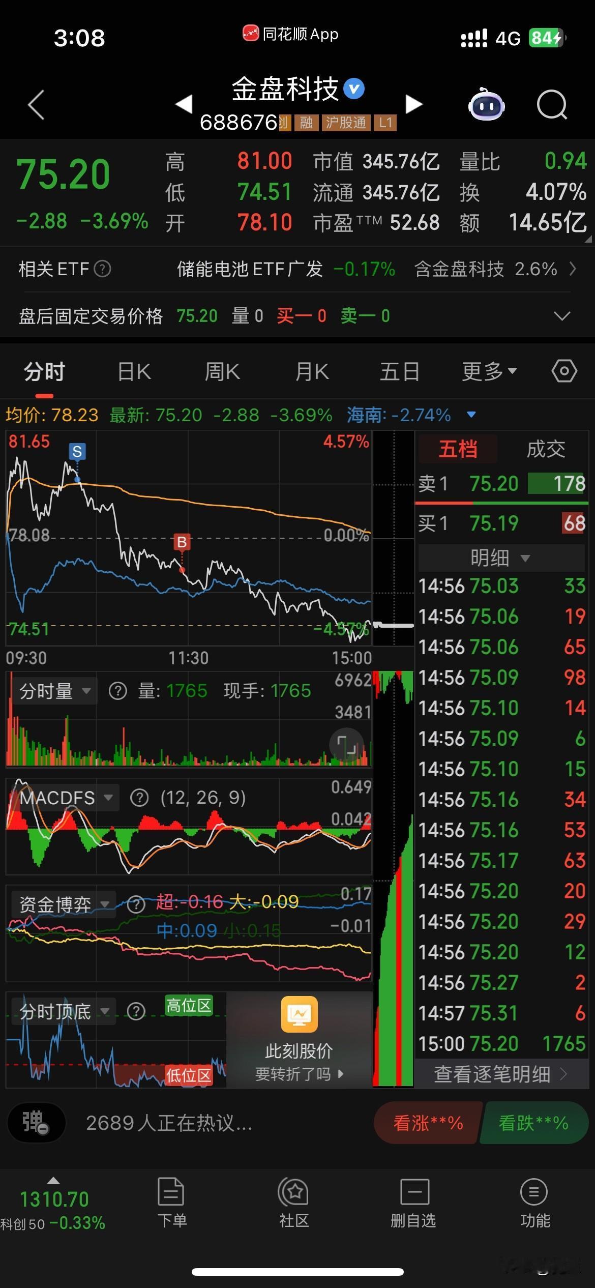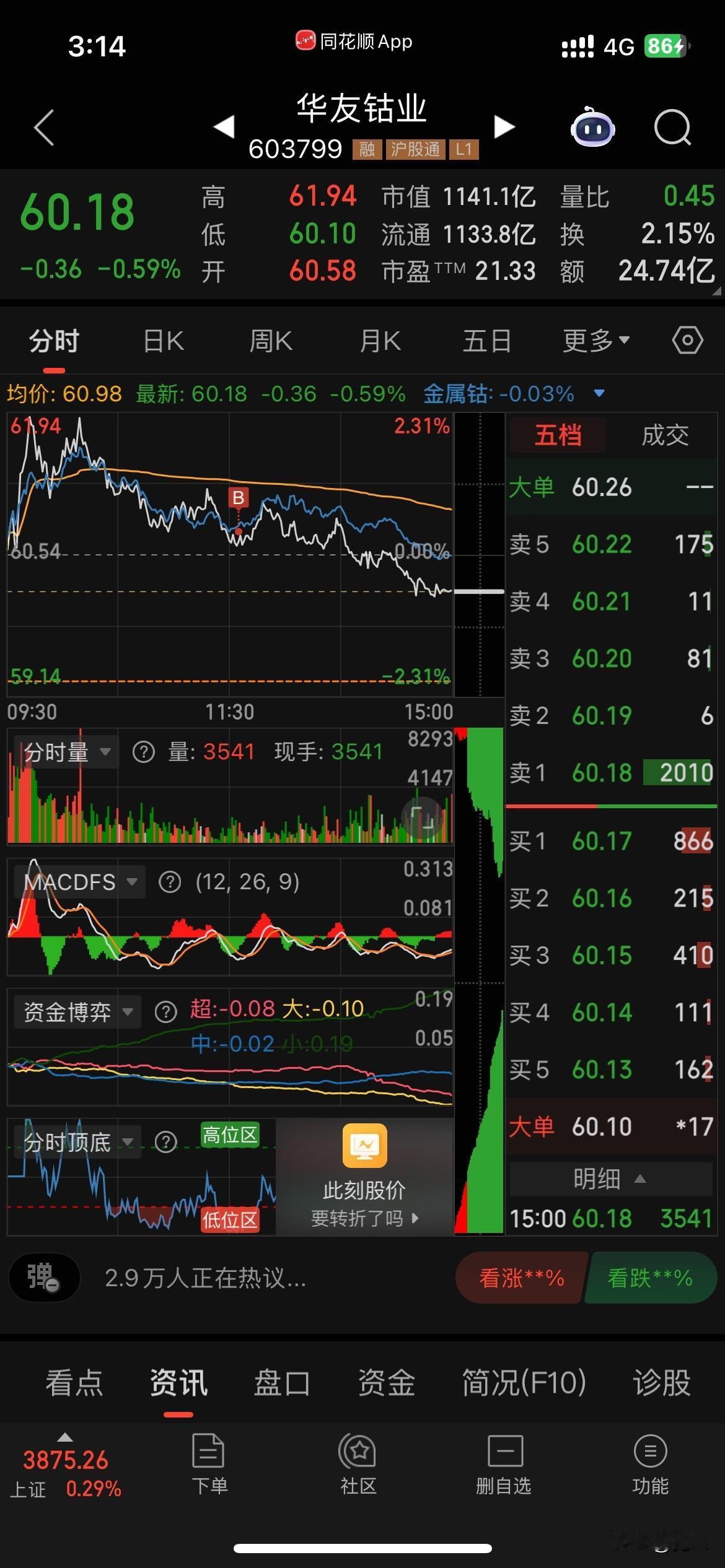 收盘了,如上午我所说下午大盘不容乐观,果然1点半后逐步下落直到尾盘。我没有坚持上