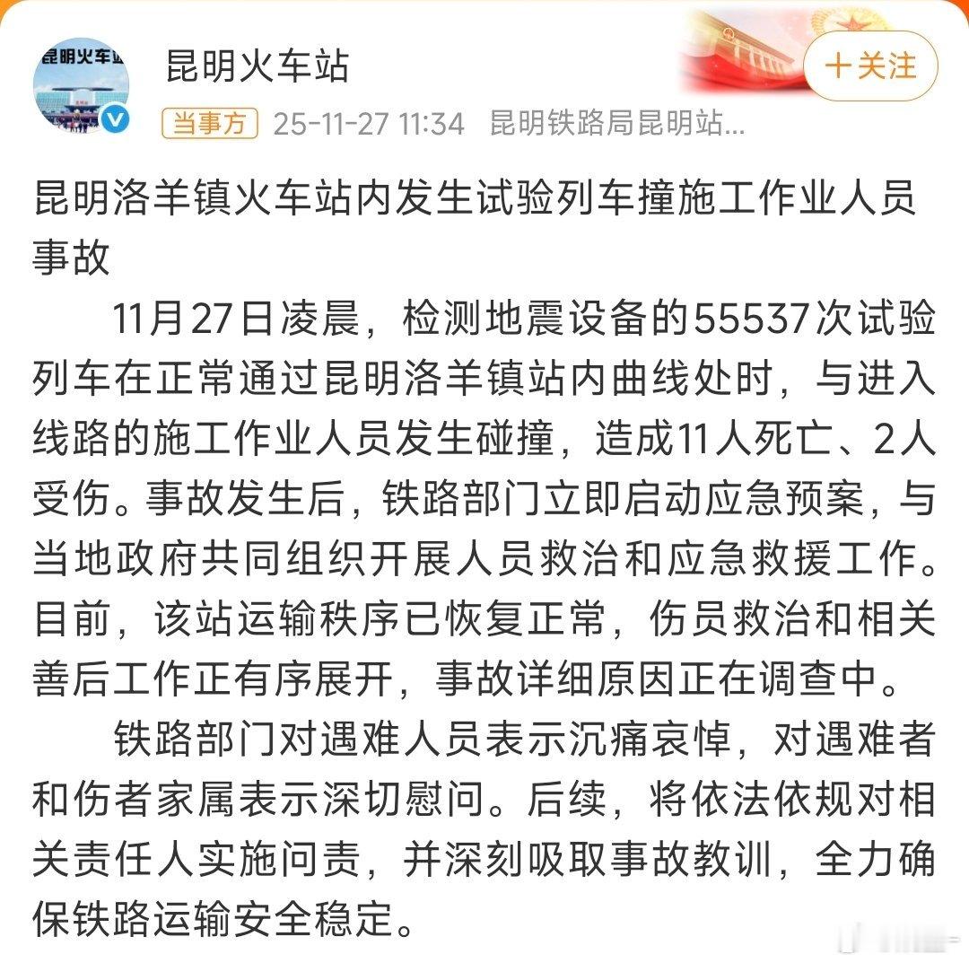 昆明一火车站试验列车撞人致11死心痛…试验列车正常通过车站,与施工作业人员发生碰撞,11人死亡、2人受伤……这种事不应该提前通知吗?得追责啊