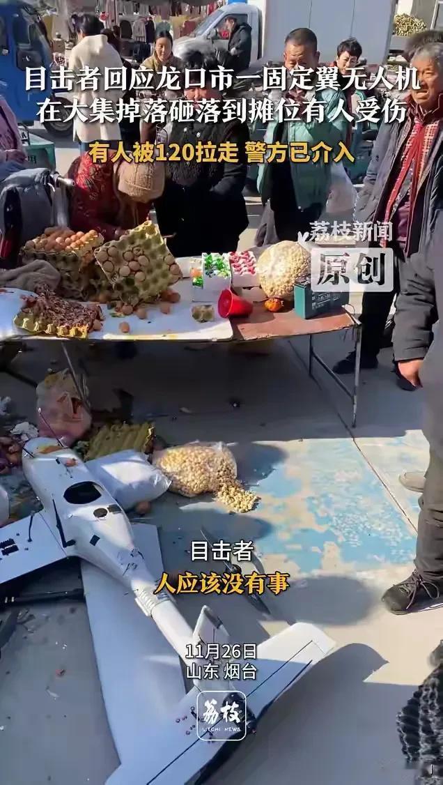 一架固定翼无人机坠落菜市场致市民受伤,警方称正在调查无人机来源。事发11月26日,在山东省烟台市龙口,一架固定翼无人机在集市区域掉落,砸到一个摊位致人受伤。 警察已到现场处理,人也被120拉走检查治疗,目前还不清楚这架无人机是什么来源?是否属于黑飞无人机?如果查到对应机主后,确认属于黑飞,将受到严厉处罚。如果属于已授权的机械事故,将对其进行罚款并赔偿人员受伤损失。