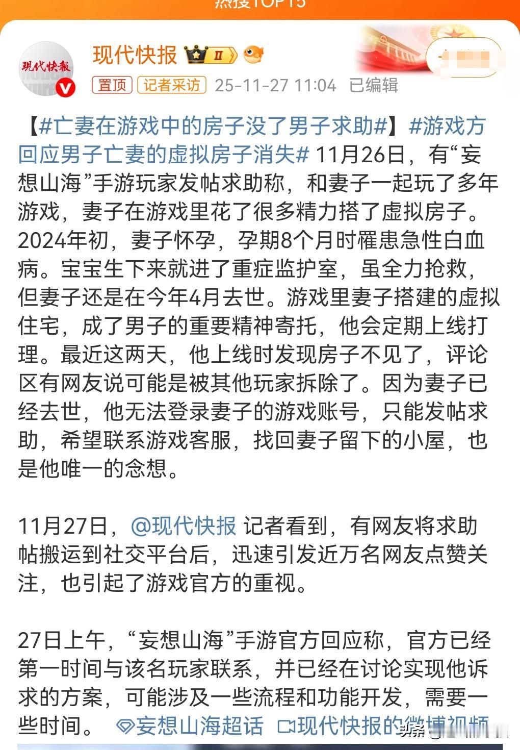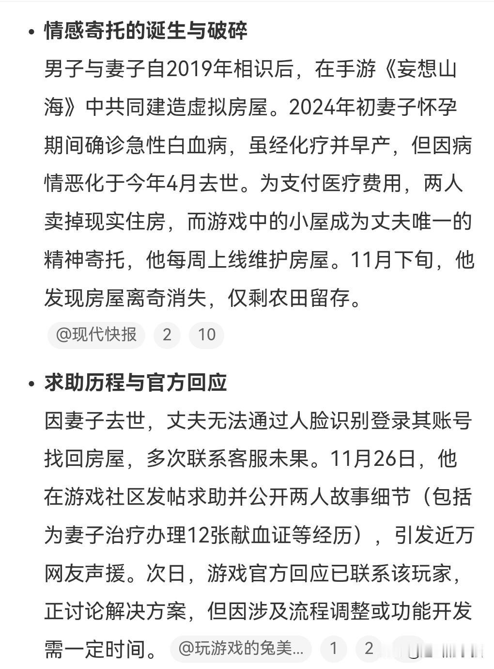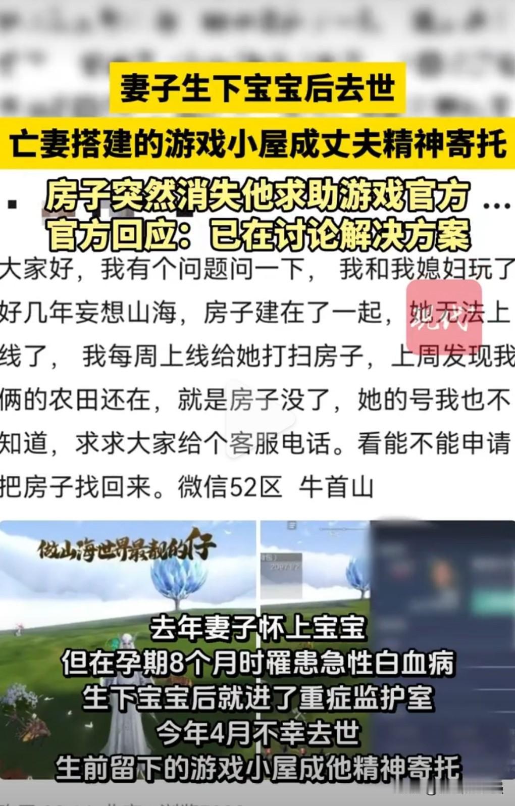 这真是太感人了,男子对亡妻的爱也是让人动容。 妻子生下宝宝后去世,亡妻在游戏中的房子没了,男子求助。 亡妻在游戏中的房子被别人拆了。 没拆之前他经常进去清理,已经当成了一种精神寄托。 没想到被别的玩家给拆掉了。 所以他向官方求助。 官方说正在讨论和解决中。 男子的这个故事真让人感动,相信官方能够解决好这个问题。