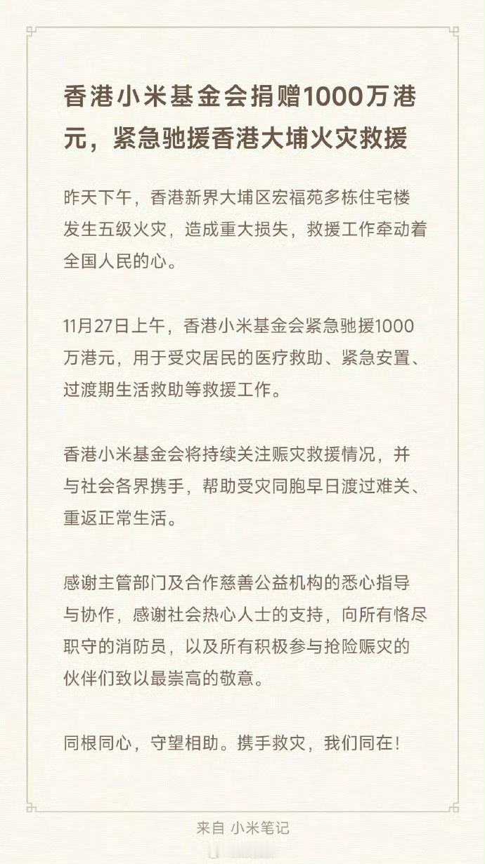 香港小米基金会捐赠1000万港元火灾无情小米有情。1000 万说拿就拿,响应速度也快。