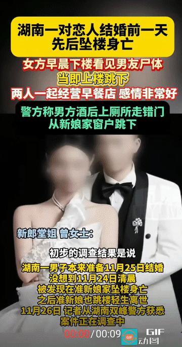 “喜宴突然变丧事?”湖南,一对原本计划在第二天举行婚礼的恋人先后从自家楼房坠亡,两个年轻生命相继消逝,这场突如其来的悲剧,让两个家庭陷入悲痛,也在网络上引发广泛关注! 来源:【江西都市现场】 这场悲剧发生在11月24日,地点在双峰县青树坪镇的一栋自建房! 据男方堂姐曾女士介绍,她的堂弟曾某某今年25岁,与同龄的女友阳某相识五六年,一起经营早餐店,原定于11月25日结婚! 事发前一晚,即11月23日晚,这对准新人和朋友聚餐喝酒后回到了女方家中! 根据监控画面,曾某某下车时步态平稳,并没有表现出明显醉酒状态! 第二天早上7点40分左右,阳某被母亲叫醒下楼,意外发现男友坠楼身亡。目睹这一场景后,阳某随即返回四楼,从同一地点跳下! 尽管被紧急送医,阳某终因伤势过重于当天下午不幸离世! 这对恋人的突然离世给双方家庭带来巨大打击! 曾女士表示,堂弟与阳某感情非常好,双方家庭都非常认可这门婚事。堂弟家庭经济条件良好,“有车有房,没有银行贷款”,23日刚将彩礼送到女方家! 对于警方初步调查提出的“酒后上厕所走错门从窗户跳下”的说法,家属明确表示不认可。 家属的质疑主要基于两点:一是监控中曾某某下车时走路平稳,没有明显醉酒迹象;二是曾某某对女方家环境熟悉,两人是同居状态。 此外,警方调查还发现了一个关键细节:凌晨5时04分,曾某某曾两次拨打微信视频电话给阳某,第一次未接通,第二次接通仅4秒便挂断。这通短暂通话的内容成了永远解不开的谜! 面对社会各界的关注和谣言传播,11月27日,双峰县联合调查处置组发布了正式通报! 通报确认,公安机关通过现场勘查、调阅监控、调查走访、法医检验等方式查明,曾某某、阳某坠楼身亡,排除刑事案件! 两个25岁的年轻生命,在即将步入婚姻殿堂的前一天突然消逝,留给家人无尽的悲痛! 他们共同经营的“无名早餐”多家门店暂停营业,原本准备好的婚礼场地也被紧急取消! 随着官方通报的发布,这起悲剧被认定排除刑事案件。无论有多少未解的疑问,两个生命已无法挽回!