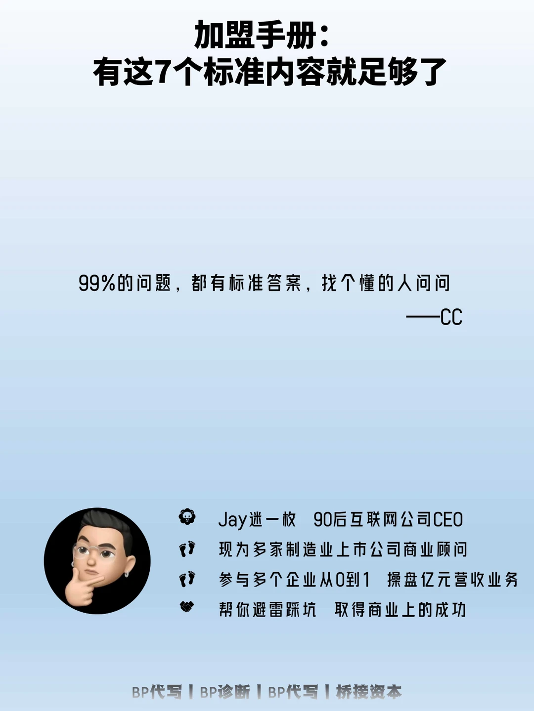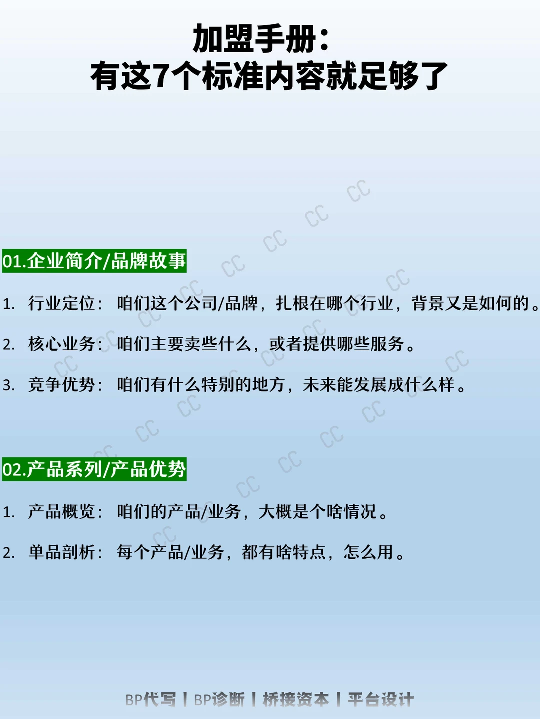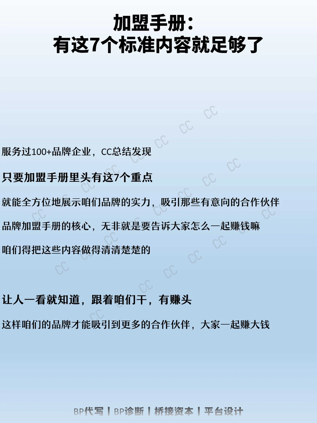 服务过100+品牌企业,CC总结发现 只要加盟手册里头有这7个重点 就能全方位地展示咱们品牌的实力,吸引那些有意向的合作伙伴 品牌加盟手册的核心,无非就是要告诉大家怎么一起赚钱嘛 咱们得把这些内容做得清清楚楚的 让人一看就知道,跟着咱们干,有赚头 这样咱们的品牌才能吸引到更多的合作伙伴,大家一起赚大钱