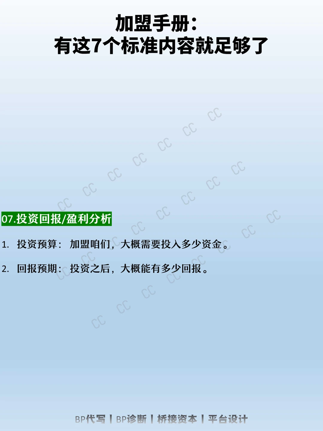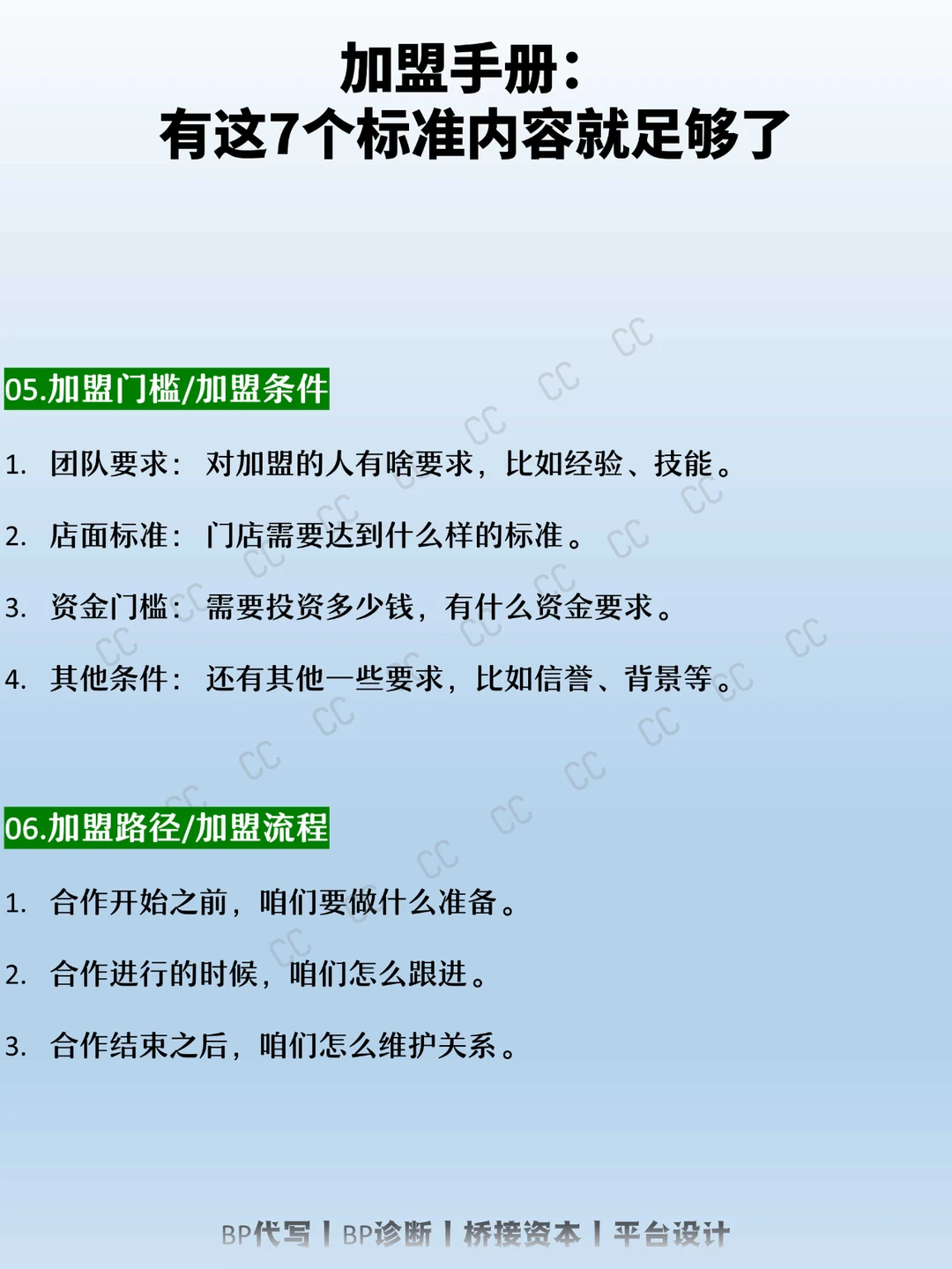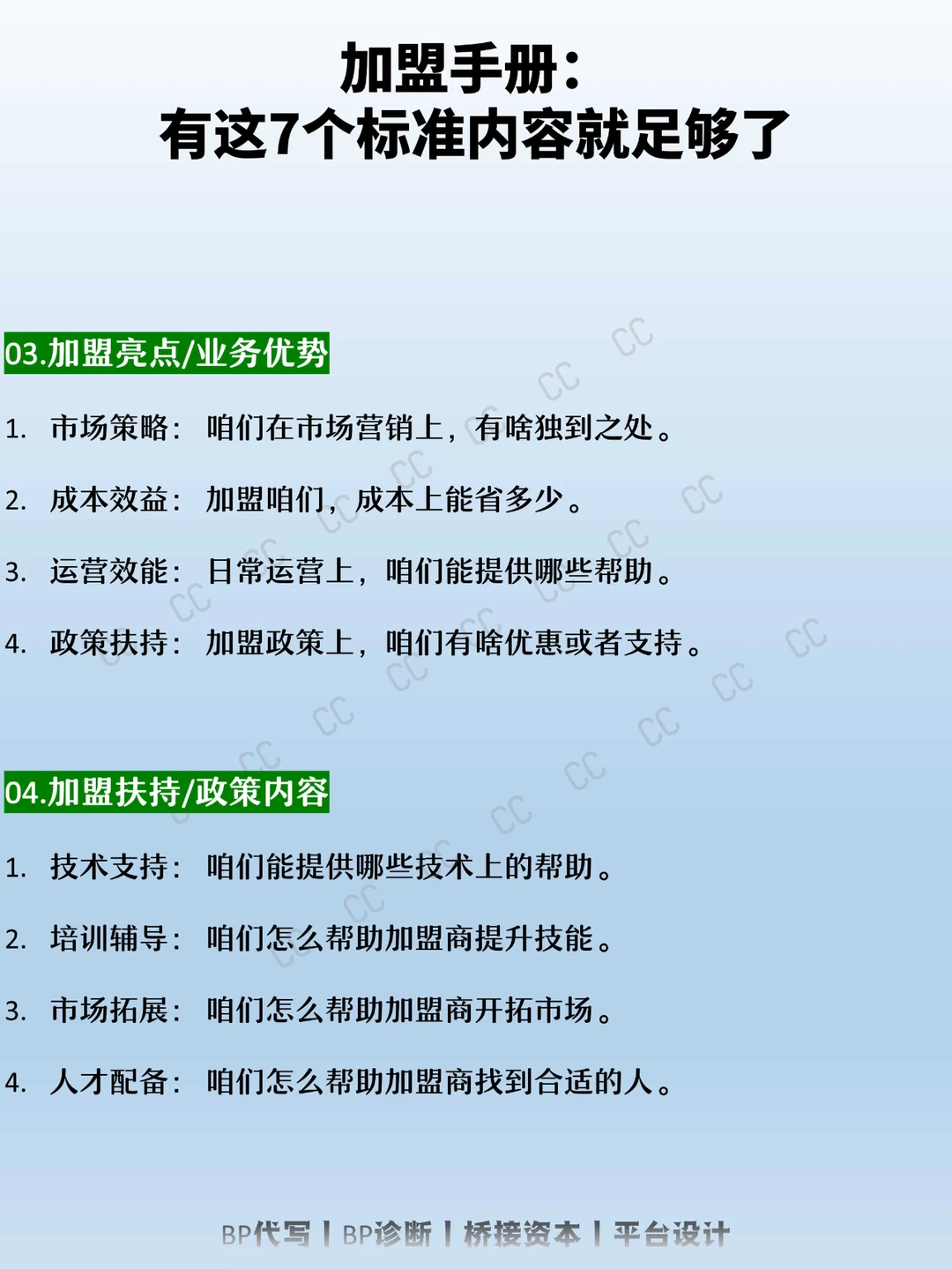 服务过100+品牌企业,CC总结发现 只要加盟手册里头有这7个重点 就能全方位地展示咱们品牌的实力,吸引那些有意向的合作伙伴 品牌加盟手册的核心,无非就是要告诉大家怎么一起赚钱嘛 咱们得把这些内容做得清清楚楚的 让人一看就知道,跟着咱们干,有赚头 这样咱们的品牌才能吸引到更多的合作伙伴,大家一起赚大钱
