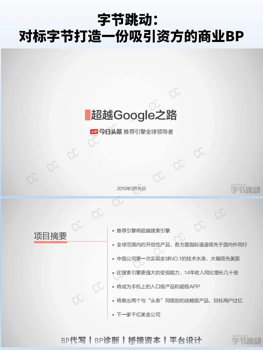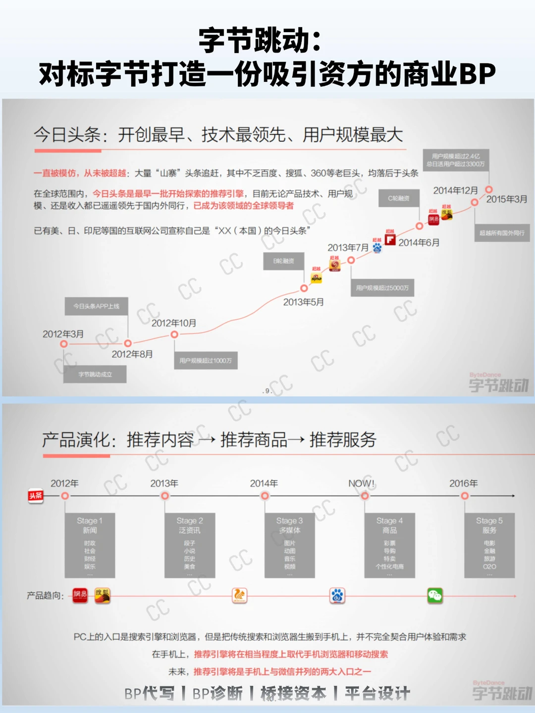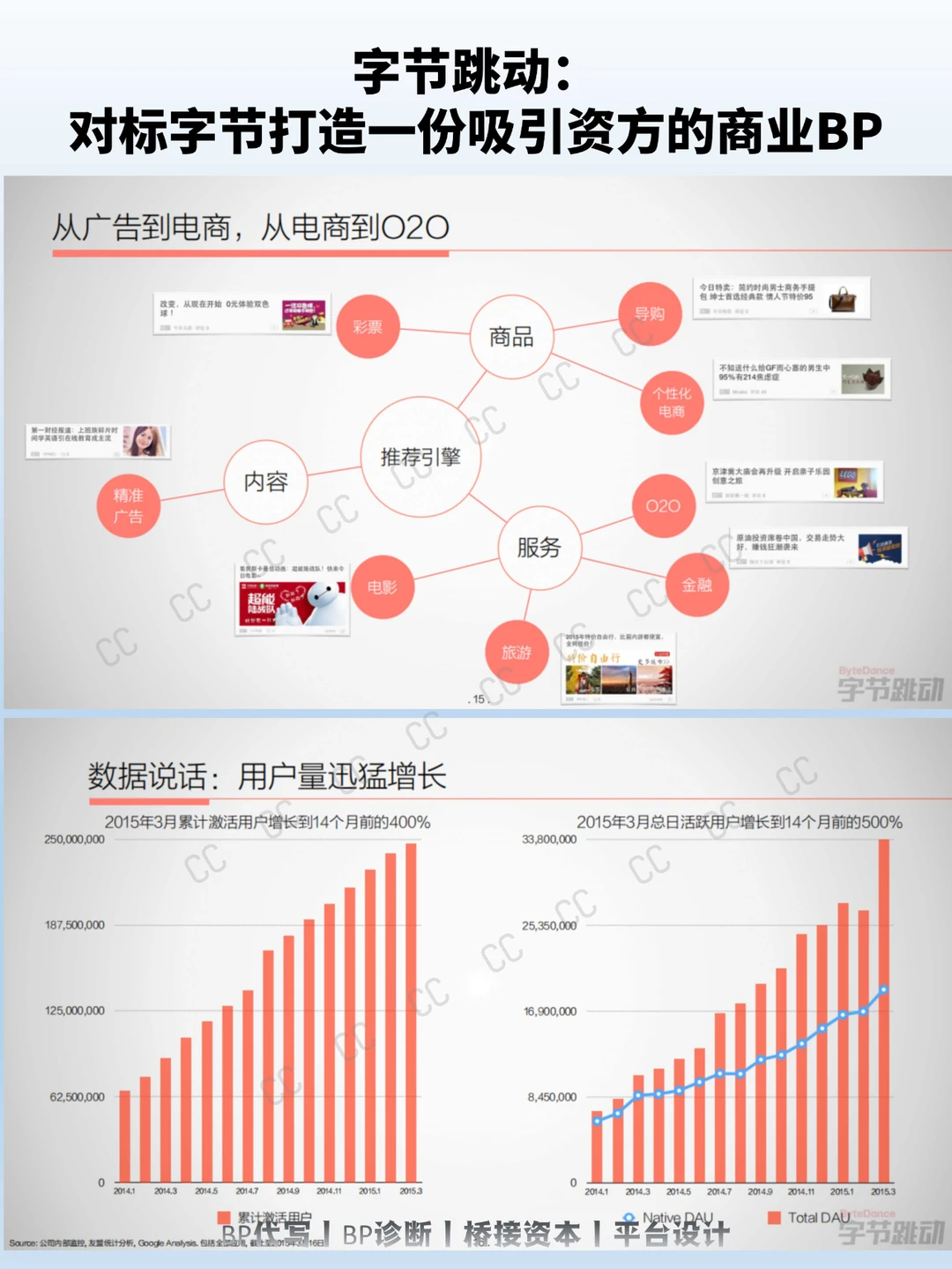 字节跳动在2015年的PPT中,用“推荐引擎将超越搜索引擎”这一明确且前瞻性的论点开篇,为整个计划书定下基调。