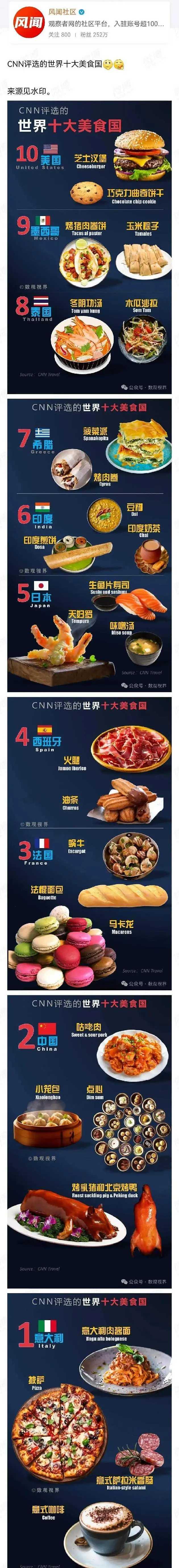美国CNN 评选出的世界十大美食之国,中国的名次让人意外!还特别推荐了糖醋里脊、苏式糕点、烤乳猪、北京烤鸭和小笼包。 CNN在榜单中盛赞中国人堪称 “全世界对食物最痴迷的人”,还用 “您吃了吗?” 这句独特的寒暄语来佐证这一点。 文章提到中国地域辽阔,菜系丰富多元,不同地区的美食风格差异极大,但北京烤鸭等是 “中国厨师妙用不同烤炉制造的奇迹”。 话说回来,即便把咱们中国排在第一名也实至名归。只不过,糕点、小笼包、糖醋里脊这些食物在中国的美食中根本就排不上队好吗? 中国的美食实在太多了,人才哥认为,四川的肥肠面、重庆的豌杂面、武汉的热干面、长沙的臭豆腐、贵州的羊肉粉....这些都比CNN说的那些好吃多了![呲牙]