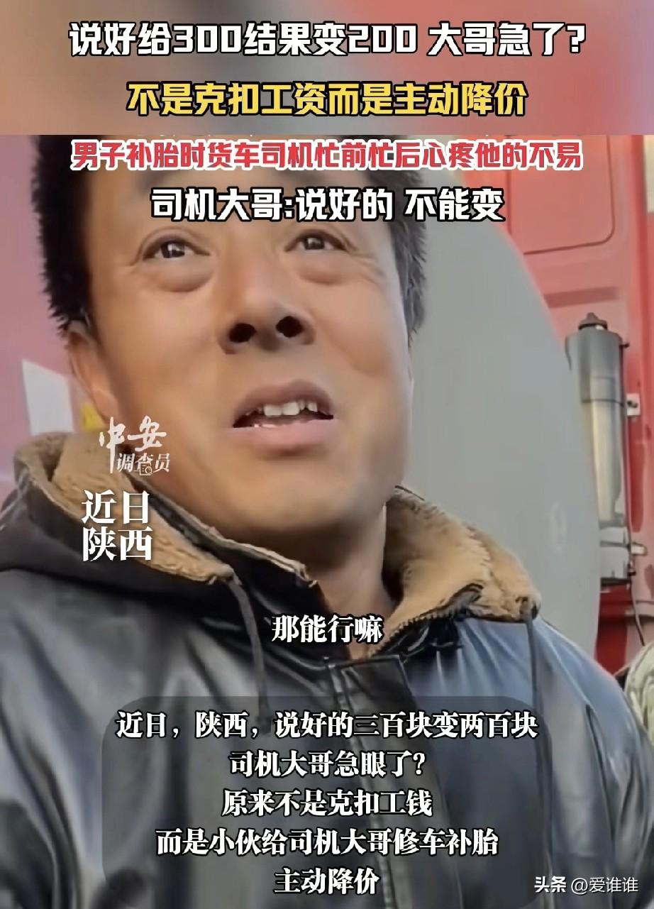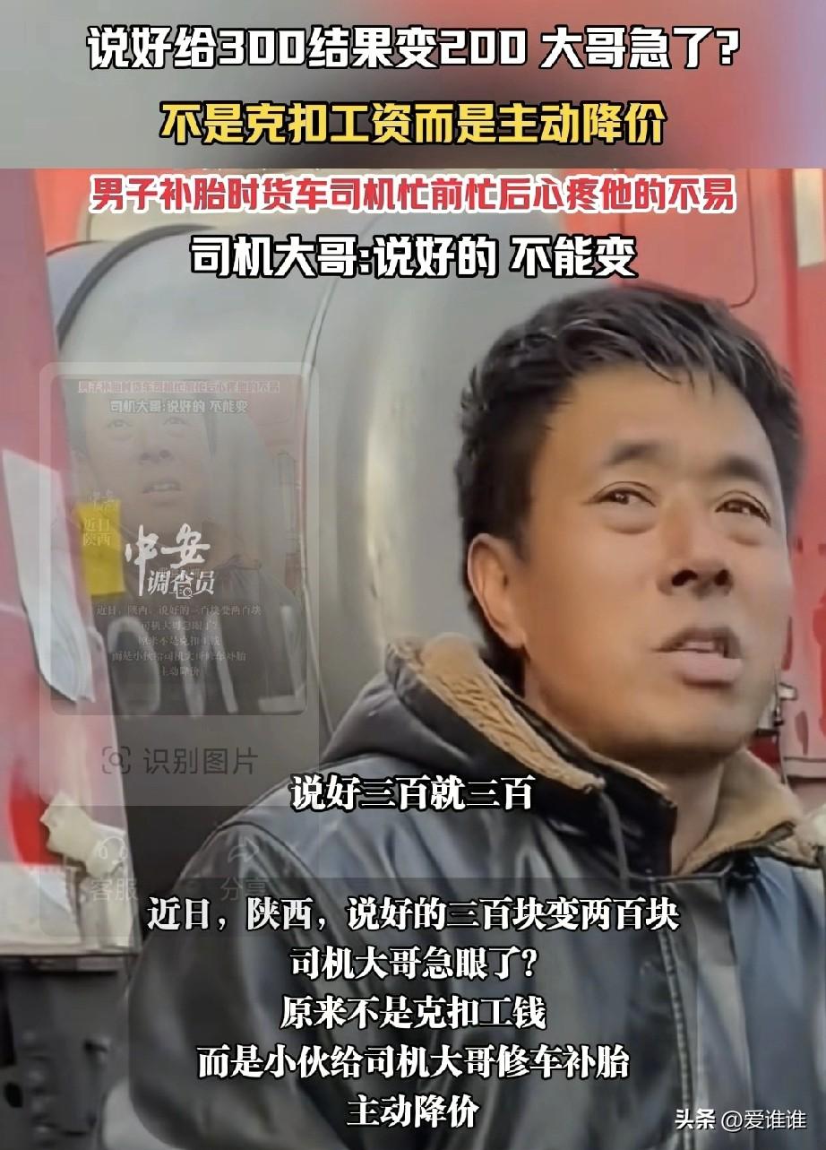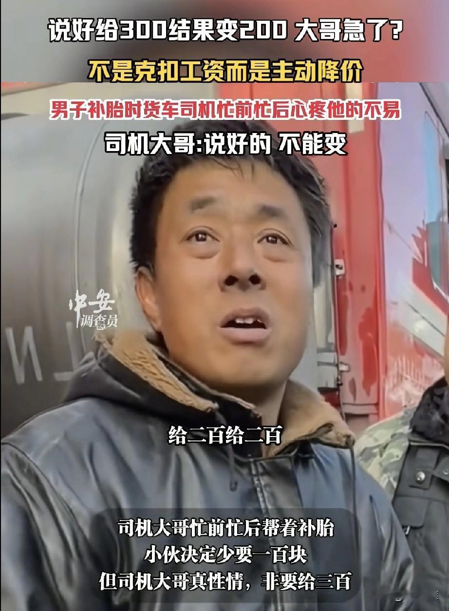 好人遇到了好人。货车司机行驶中遇到爆胎,联系修车师傅后对方报价300元,司机觉得价格公道就让修车师傅赶紧过来,修好后司机按照商量好的价格付款时却被修车师傅拦了下来,师傅说:“你们跑大车的啊容易,给200就行!”司机很是感动,却要坚持按300付款! 一位跑货运的司机师傅正开着大货车在路上跑着呢,突然“砰”一声——爆胎了,这前不着村后不着店的,他赶紧掏出手机联系修车师傅。 电话那头,修车师傅问清楚情况,很干脆的报价:“300块,包修好。”司机一听,这价钱挺公道,觉得人家还得大老远开车过来,油费也得不少,二话没说就答应了。 修车师傅来得挺快,到了地方连口水都没喝,直接撸起袖子就干,大车轮胎不比小车,死沉死沉的,卸下来费了老大劲,只见师傅又是撬又是扛,忙活得满头大汗,工服都湿透了,不过师傅手艺确实好,没多久就把新轮胎换好了。 结账的时候,司机正要掏钱,修车师傅却摆摆手:“这样,你给200就行了。”司机当时就愣住了,他跑车十几年,修胎补胎的经历多了去了,有时候赶上急着送货,人家还会临时加价,这主动降价的,还真是头一回遇见。 “那哪行啊!”司机赶紧说,“说好300就300,你大老远跑来,这么辛苦,该收多少收多少。” 修车师傅却挺坚持:“我看你们跑货运的也不容易,现在油价涨,过路费也贵,你们赚的都是辛苦钱,能省一点是一点。” 两个人就在路边你推我让起来,最后司机灵机一动,趁修车师傅转身收拾工具的工夫,飞快地扫码付了300块,然后一把按住师傅的手:“老哥,这钱你必须收着。大家出来干活都不容易,你情我意我领了,但该给的钱一分不能少。” 事情传到网上,好多网友都被感动了,有个网友说:“我爸爸也是开大车的,经常遇到修车坐地起价,像这样主动少收钱的师傅,真是难得。”大家都说:这两个人都是实在人,修车师傅能体谅跑车的不易,司机也懂得尊重别人的劳动,你为我着想,我也为你考虑,这种互相体谅的情谊,特别暖心。 说实在的,300块的修车费本来就不算贵,师傅愿意少收100,是他的善良;司机坚持要给够,是他的厚道。 事情虽然不大,却让人看到了普通人之间最可贵的东西:将心比心,你敬我一尺,我敬你一丈,在这个世界上,还是好人多啊。