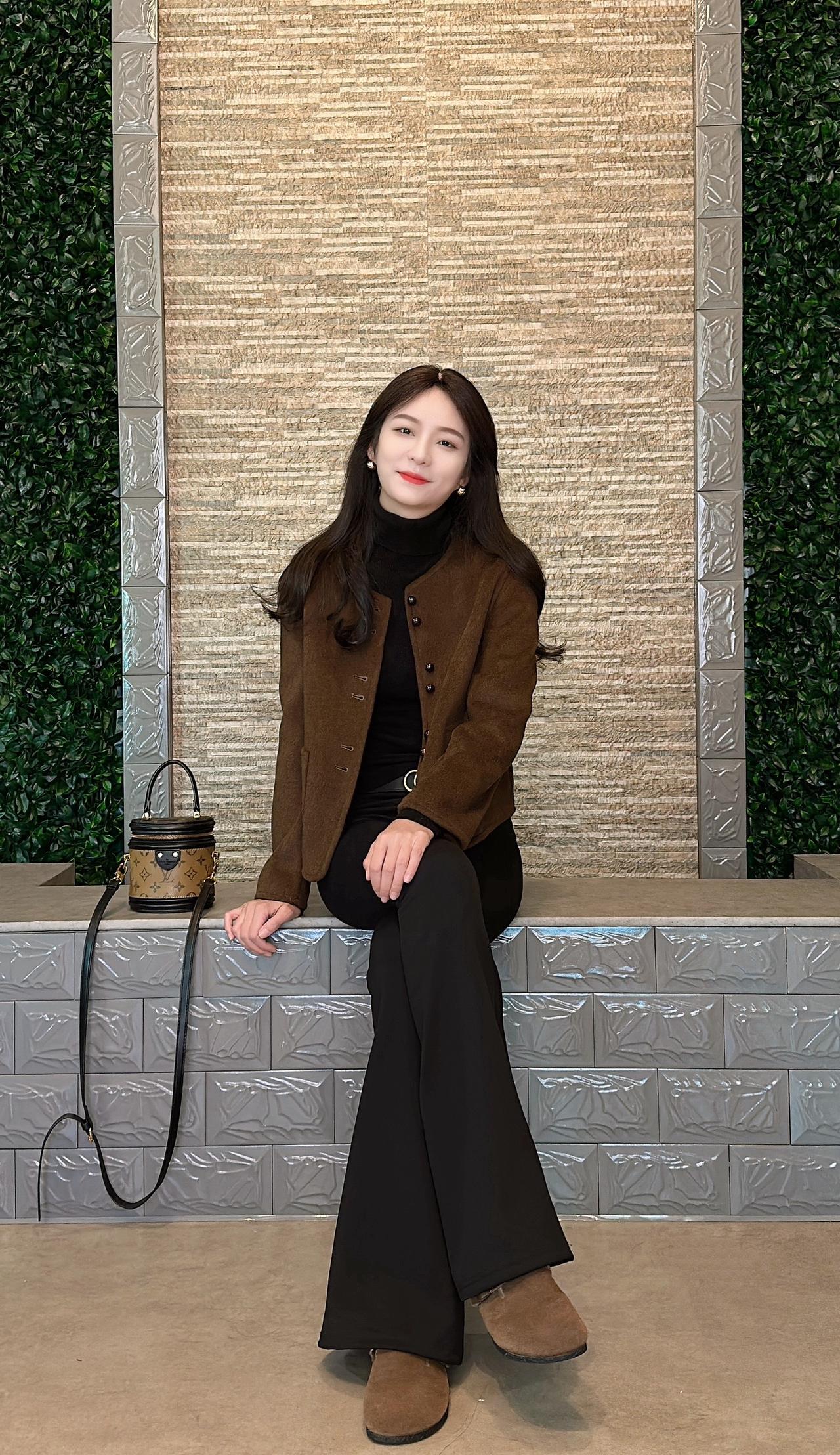 黑色短款面包服配紧身裙的“上暖下露”冬季穿搭
