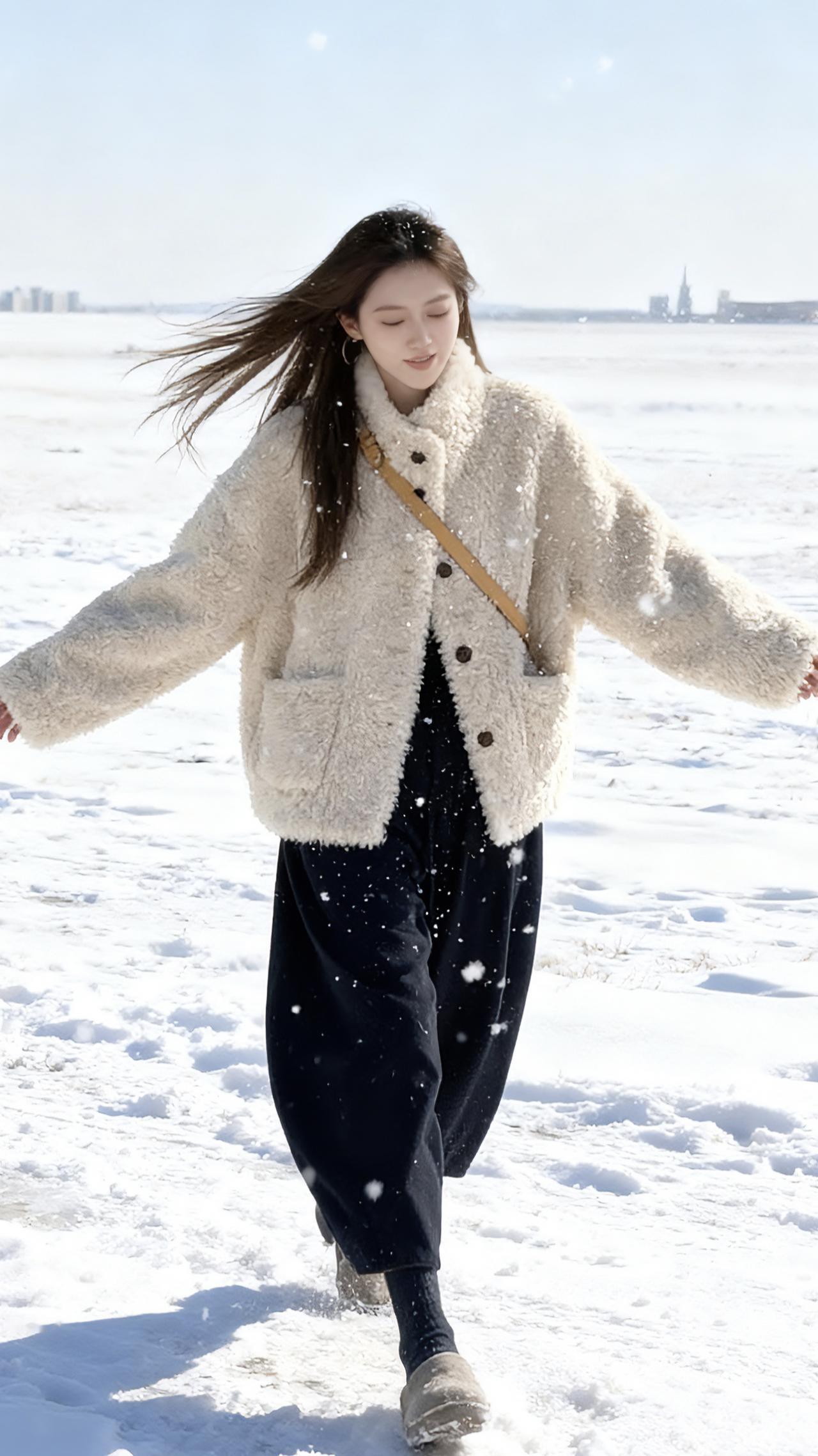 降温这么穿,温暖时髦全都有!这一组很适合怕冷的姐妹们,宽松的皮毛一体外套搭配直筒