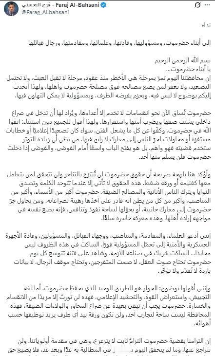 由于南方各势力这几天调兵谴将准备打“内战中的内战”,前也门哈德拉毛省省长、总统领导委员会副主席巴斯哈尼发文呼吁目前哈德拉毛各方保持克制,不要将矛盾激化。 不过巴斯哈尼已经老了,实权也不太大了,因此他的呼吁可能没啥影响。