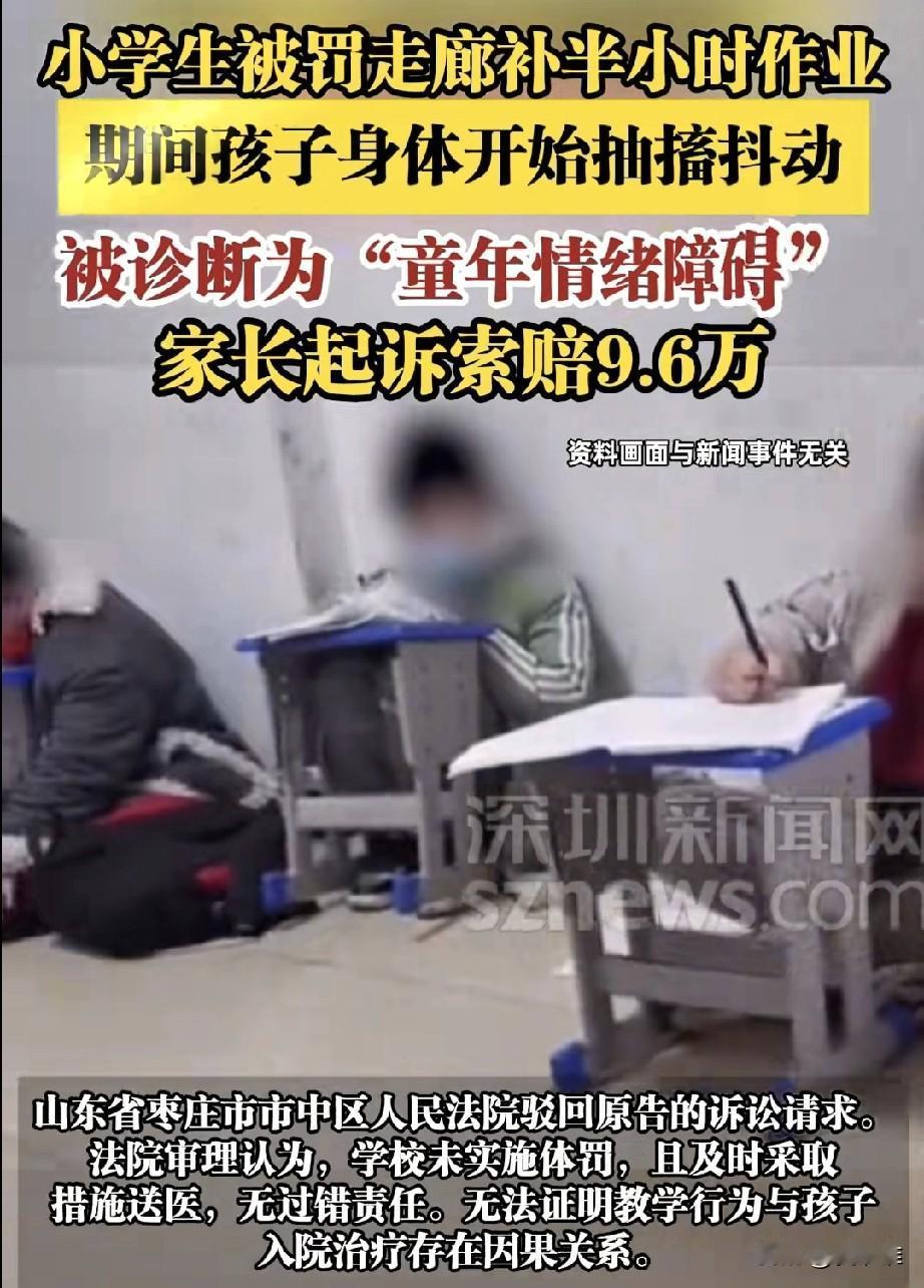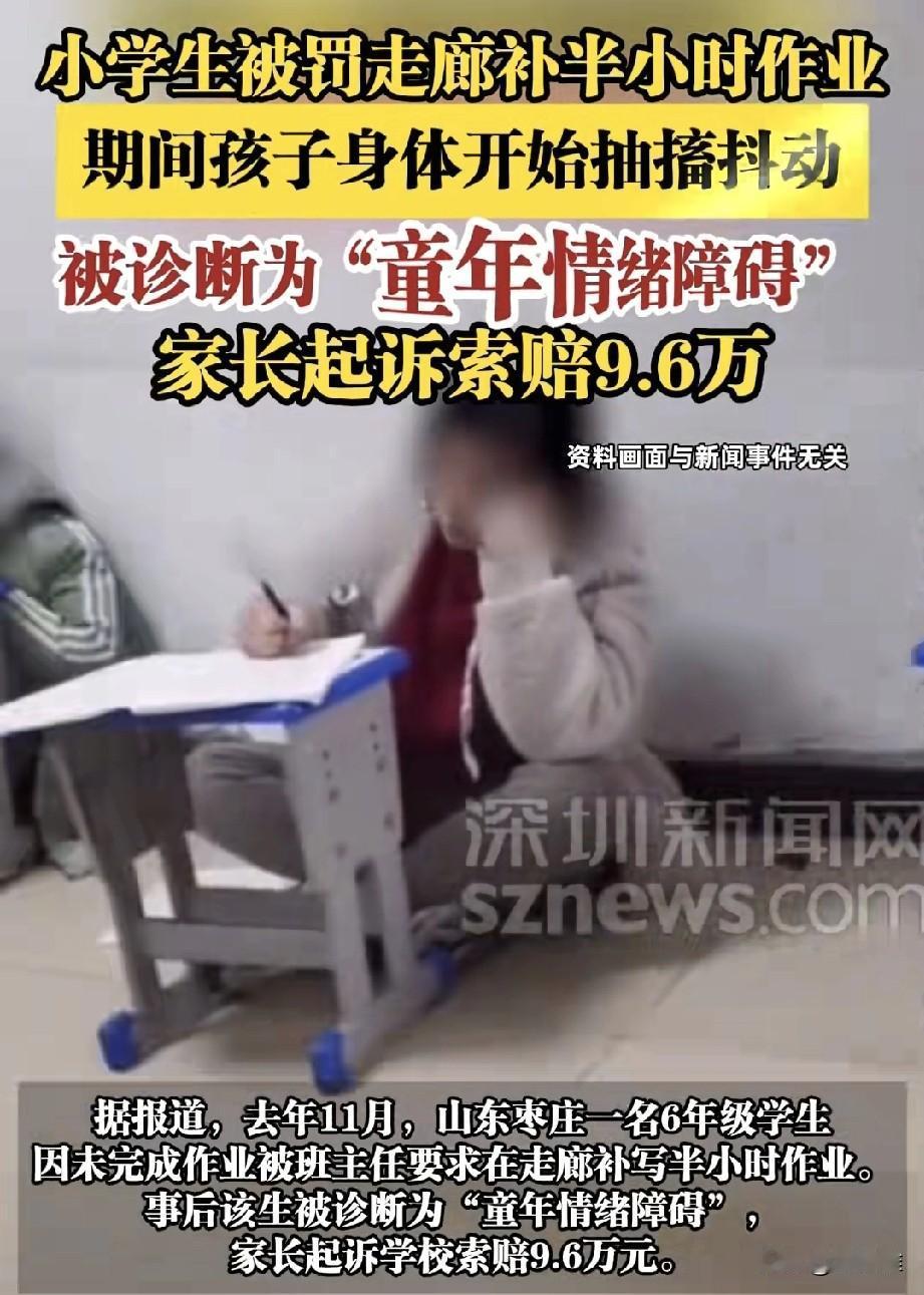 打不得,骂不得,说不得!老师课堂上检查作业发现几名学生没有完成,于是让他们去走廊完成作业在进入教室,不一会其中一名学生状态不对,家长带他去医院检查出:“青少年情绪障碍。”家长认为是学校的责任,将学校告上法庭要求赔偿! 去年十一月,班主任检查作业,发现小张和其他六七个同学都没写完,老师心里有点着急这都要期末了,学习态度得端正啊,她就让这几个孩子到教室外面的走廊上补作业。 期间老师既没打也没骂,就是让他们把该做的作业补上,大概半个多小时,孩子们都陆续补完回教室了,小张也跟着进来了。 可谁知道,过了一会儿,老师发现小张不对劲,整个人蔫蔫的,身子还在微微发抖,老师一看就知道孩子不舒服了,马上给小张妈妈打电话:“你快来接孩子去看看病吧。” 但小张妈妈正在忙,实在抽不开身,说让孩子自己回去,老师不放心放学后还特意安排了两个同学,陪着小张一起回家。 没想到从那天起,小张就像变了个人,始终打不起精神,从十二月开始,爸妈带着他跑了好几家医院,枣庄的、济南的都去了,最后确诊“童年情绪障碍”。 好好一个孩子突然得了这个病,家长心里很难受,他们左思右想,觉得就是那天在走廊补作业惹的祸,他们认为这是变相体罚给孩子心里留下了阴影。 家长越想越觉得是学校的责任,一咬牙就把学校告了,要求赔偿九万六千多块钱,包括医药费、护理费。 学校那边也委屈得不行:“我们老师一没打二没骂,就是正常的教育管理,发现孩子不舒服,马上联系家长,还派同学护送回家,该做的都做了啊!” 两边谈不拢,最后只能对簿公堂。 法庭上,法官仔细看了当天的监控,确认老师确实没有体罚行为,而且发现小张不对劲后,十分钟内就联系了家长,最关键是,家长想证明孩子的病和补作业有关系,前后找了六家鉴定机构,结果人家都说:“这个我们鉴定不了。” 最后法院判决老师让学生补作业是正常的教育行为,学校已经尽到了管理责任,不需要赔偿。 老师觉得就是正常的管教,家长却觉得伤了孩子的心,好在法律给了个公正的说法,只是不知道小张现在怎么样了,希望他能慢慢好起来。