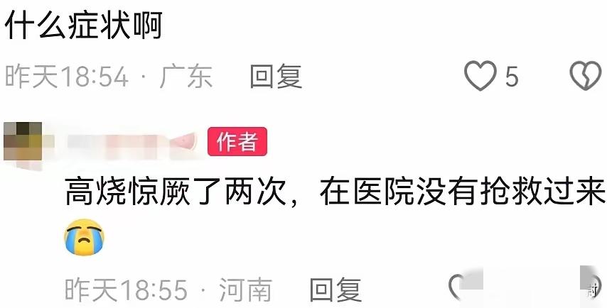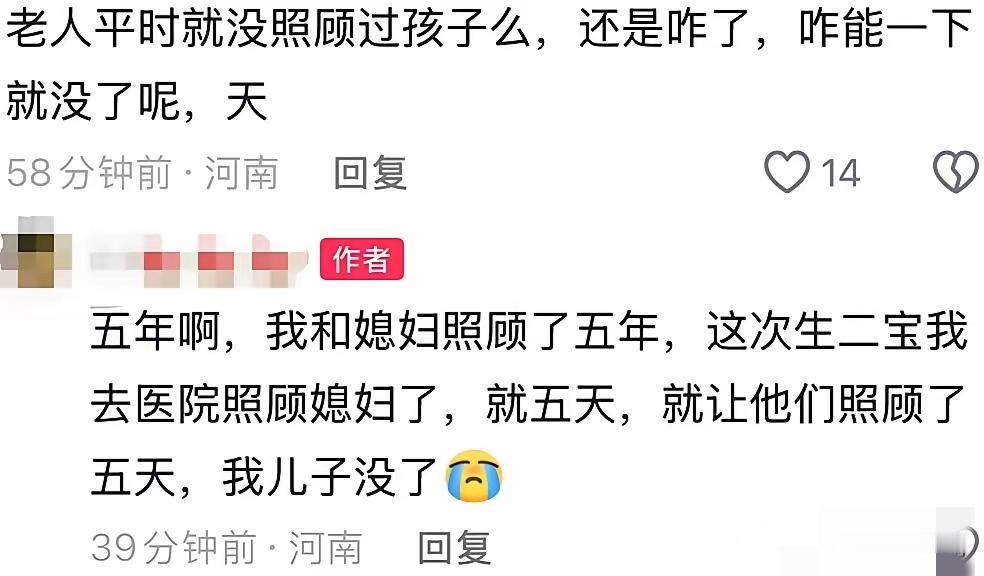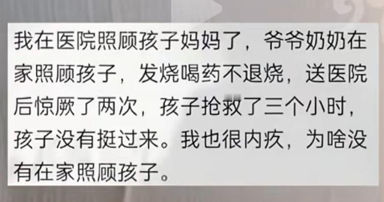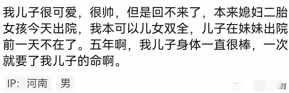 “儿子很可爱,很帅,但是回不来了,本来媳妇二胎女孩,今天出院,我本可以儿女双全,儿子在妹妹出院前一天不在了,五年了,我儿子身体一直很棒,一次就要了我儿子的命了”! 这是一个父亲的哭诉,好好的一个儿子,刚刚5岁,感冒了,却永远离开了这个世界。 他在医院陪妻子生二胎,5岁儿子跟着爷爷奶奶在家,没想到,5天就在家生病离世。 这是每一个做父母的 不能接受的结果。 他们的儿子,就在生女儿出院的前一天,没有了! 他陪着妻子去医院生二胎,5岁的儿子在家跟着爷爷奶奶。 二胎妹妹生了,准备出院的前一天,5岁的哥哥在家里去世了。 这个父亲说:五年啊,我和媳妇照顾了五年,这次生二宝,我去医院照顾媳妇了,就5天,我就让他们照顾了5天,我儿子没有了。 看着这个父亲痛苦的样子,着令人难过。 五年了,一家人精心呵护的儿子,就要见到妹妹了。却以这样突然的方式永远定格在5岁。 5岁的儿子,还给自己的妹妹起了一个名字,叫念念。 难道他知道自己将来的事情吗? 让自己的妹妹永远念着自己? 不敢说是不是老人大意了。 爷爷奶奶也是非常难过到心碎。 爷爷奶奶的隔辈亲是真的。 但是爷爷奶奶对于孩子的粗放也是有的。 不过,只能怪这个病毒太厉害了,让5岁的孩子中招了,让爷爷奶奶大意了。 爷爷奶奶怎么都不会想到,一个普普通通的发烧,就让孙子烧坏了。 老人觉得普通,可是这个感冒发烧不普通。 孩子高烧两次,都惊厥过去两次,医院都来不及抢救回来。 这个事情,最难过的应该是孩子的妈妈。 自己的爸爸都不敢告诉她。 她刚刚生完二宝,正身体虚弱的时候。 如果让她知道这个噩耗,不知道会怎么样? 这是一种难以弥补的遗憾。 老人照顾孩子的困惑,以及生死无常的无力感,还有深深的愧疚感。 悲剧已经发生了,再难过也解决不了问题。 希望这个二胎念念妹妹的到来,能够让他们一家人忙碌起来,才能渐渐忘记失去哥哥的悲痛。 她会在父母的爱里,陪着父母,父母也会告诉她,她有一个好哥哥,曾如此深爱过她,曾经给她起了一个永远忘不了名字,念念。 愿她怀念哥哥。 愿他们一家人幸福。