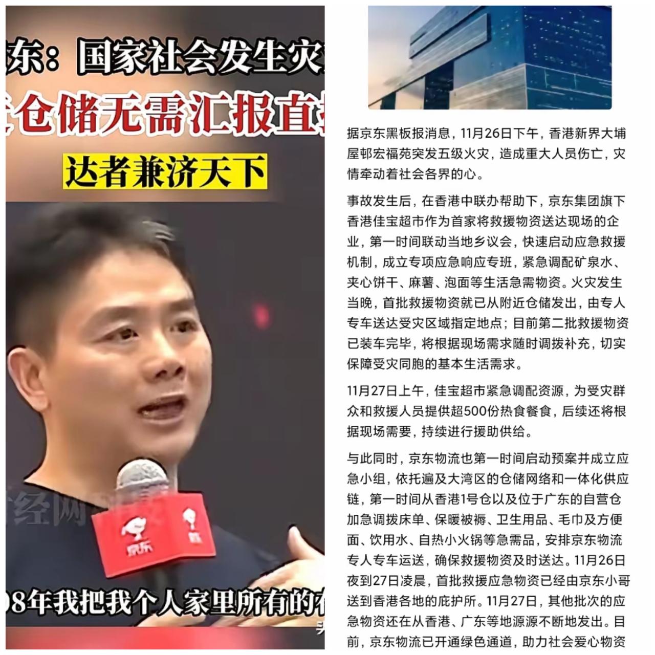 香港大埔宏福苑大火让人揪心,而京东的驰援速度直接刷新认知! 火灾当晚,旗下佳宝超市就成了首家送物资到现场的企业,京东物流从大湾区自营仓连夜调拨被褥、食品等急需品,这效率真不是吹的。 关键在于京东的自营模式太顶用了,刘强东早有规定:灾难面前,就近库房无需汇报就能直接捐。反观淘宝、拼多多这些平台,大多靠第三方卖家,商品归属权不在平台,想捐都没那么利索。 这哪儿是单纯的企业援助,分明是自营模式攒下的硬实力——关键时刻,能直接掌控的资源才是真底气。