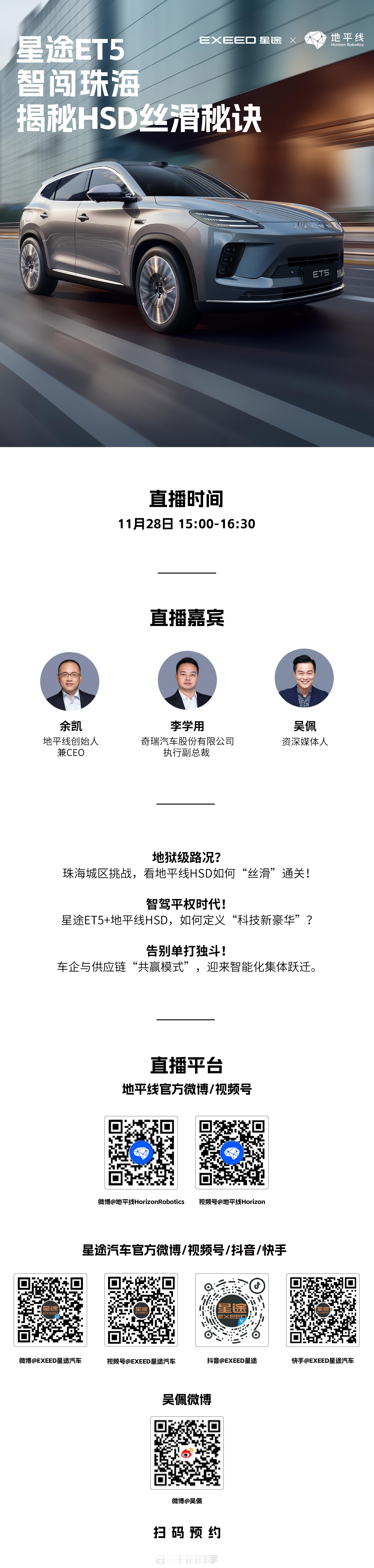 地平线智驾HSD到底有多强?11月28日的星途ET5智驾直播就要实地验证!这次直播路线全程都是市区核心的高难度路况。人车混行密集、路口交织复杂,还有频繁加塞、电驴穿梭、无保护转弯等通勤路上的“拦路虎”,每一段都在考验智驾的真功夫。就想看它全程类人思考,打破“智驾不敢走市区”的偏见!地平线HSD量产开启国民智驾时代地平线智驾HSD量产上车地平线大算力智驾芯片征程6P上车高阶智驾不再高价5与伦比TheBest5