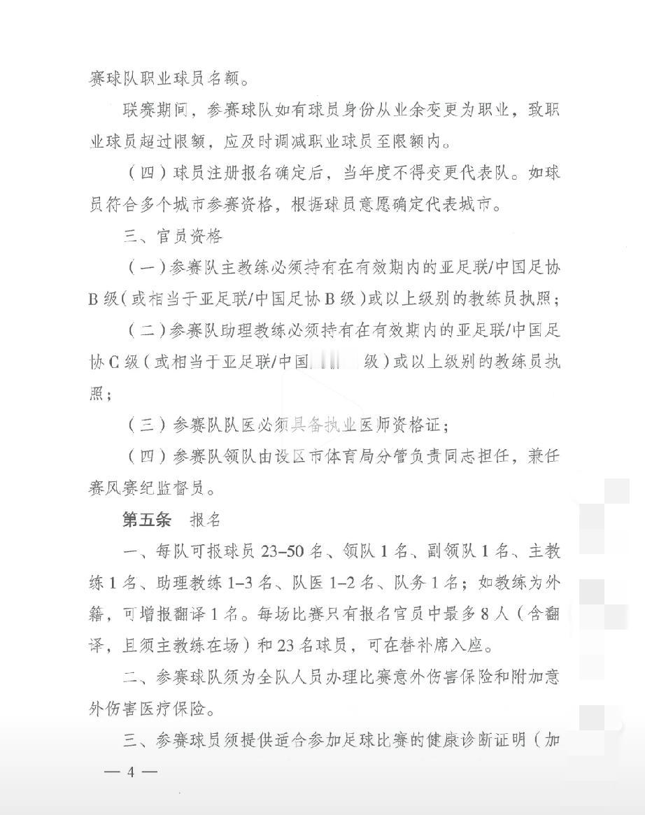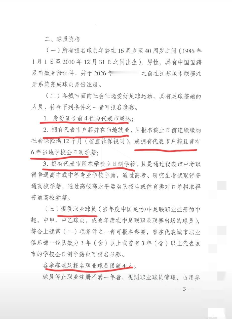 苏超组委会公布2026年的竞赛规程。其中让众多网友特别关注的就是参赛球员的资格审核办法。 有符合下列条件之一者都可报名参赛: 1、身份证号前4位为代表市属地。 2、拥有代表市户籍并在当地就业,或拥有代表市户籍且曾有6年当地学校全日制学籍。 3、现役职业球员曾在代表市职业俱乐部效力三年。各参赛球队报名职业球员限额4人,同时上场不得超过两位。 …… 从规则看上去,重点限制了钻空子式的临时摇人。下赛季这种摇人方式肯定是行不通了,但并没有说限制所有职业球员。 还有区别于25赛季的是,淘汰赛阶段实行主客场赛制,这样看下来要比25赛季多出6场比赛。