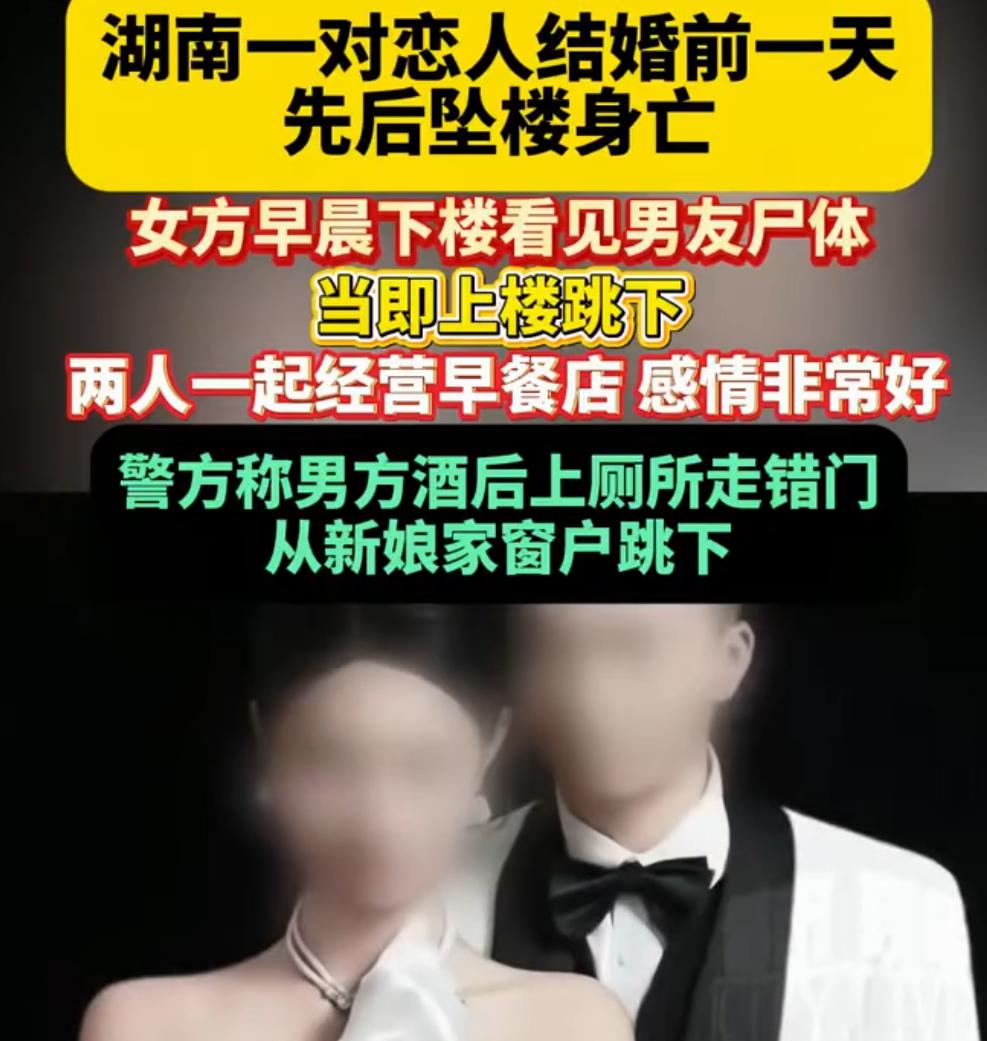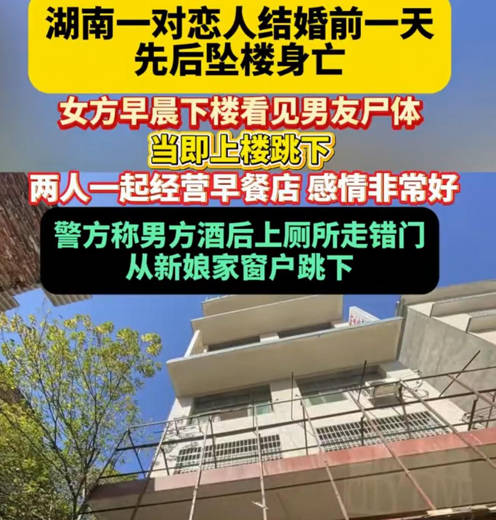 一对准新人结婚前一天 同一地点双双坠楼身亡 调查结果出来了 不是因为彩礼,也不是因为感情,纯属意外,也排除了刑案。 事发地为女方家自建房的四楼,男子醉酒凌晨从窗户掉下,疑因把窗户误当成厕所,窗离地有1米多,酒醉心里明,也许是睡懵了。 发现新郎的时候是6点半左右,报警时间是7点十分左右,相关部门调取了新娘的手机,发现新郎凌晨5点多还给新娘打过2个微信电话。 一个没接,一个接通了4秒,对此通报并未给予明确说明,另外网传新娘怀有身孕,不实,这点新娘家属证实了。 男子开了三个早餐店,宝马车代步,彩礼也已给到了女方家,经济条件不错,而新娘接受不了新郎坠亡的事实,选择了随他而去。 男方家属起初质疑男子出事的原因,今天相关部门确认了,就是意外,可惜了一对新人,喜事变丧事,白发人送黑发人悲痛欲绝。 想起了有句歌词:“不懂爱恨情仇煎熬的我们,还以为殉情只是古老的传言…” 小伙坠楼 高楼坠楼