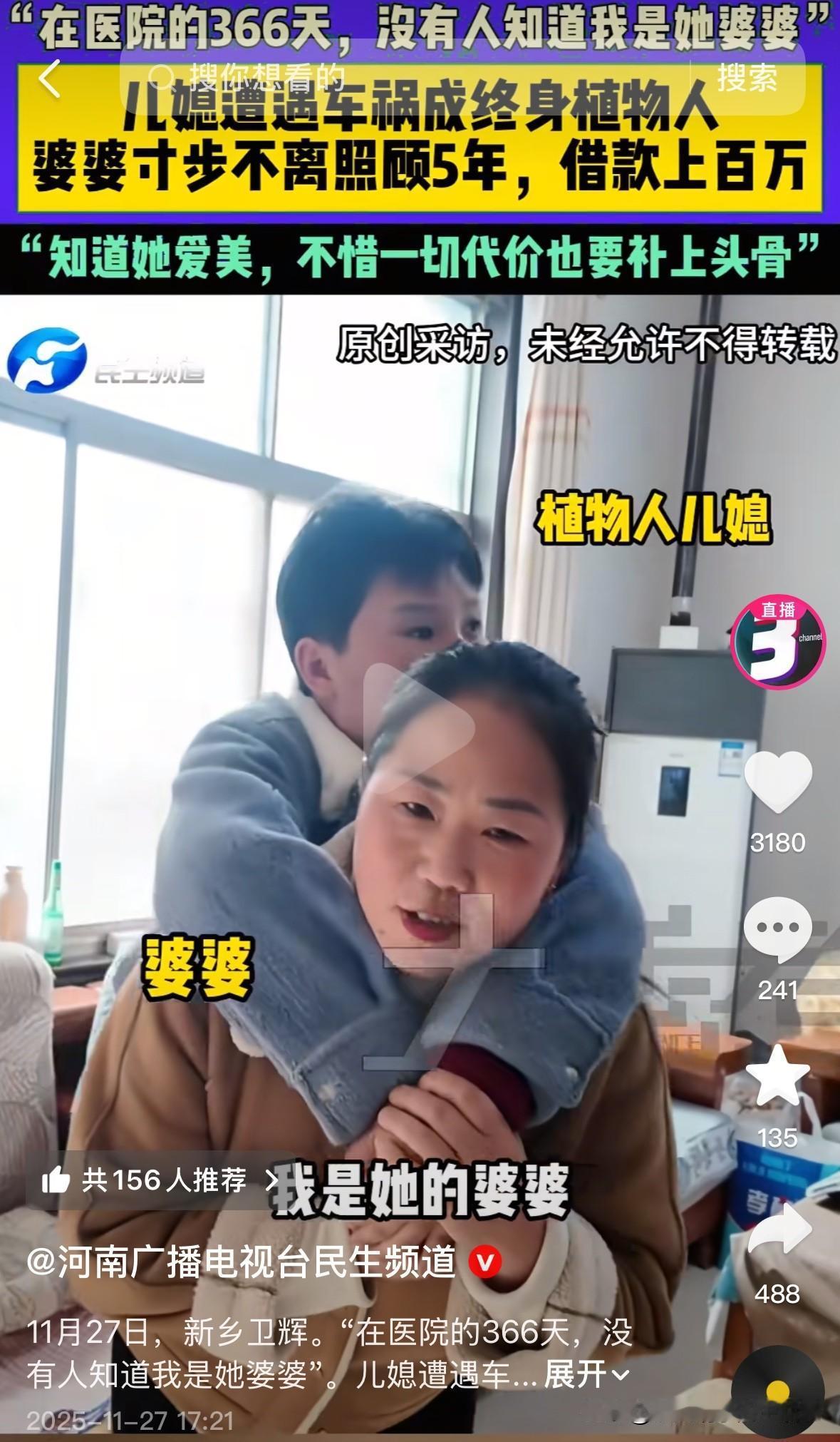 太感动了!河南新乡卫辉,一女子的儿媳因车祸成终身植物人,医生称救活的几率很小,但女子不想放弃,借款上百万只为救活儿媳,毫无怨言的照顾5年,还坚决不让儿子再娶妻。 2020年的6月,儿媳遇车祸送到医院,医生表示救活的概率也就1%,言外之意让他们放弃。 女子称,她赶到医院看到儿媳,儿媳冲着她喊了一声“妈”,就为这句话,她也要尽全力救她。 儿媳经历3次开颅手术,四个月才睁开眼睛,在医院住了366天,她就照顾了这么多天,白天贴身伺候,晚上就躺在床边的地板上。 知道儿媳爱美,就花钱把她缺失的头骨补上。在儿媳出事的这几年,她毫无怨言的照顾着,想着就这样伺候她一辈子就行了。 儿媳从最开始被医生诊断为植物人,到现在可以自己拿勺吃饭,中间的辛苦只有她们自己知道。 有网友称,即便是亲妈也不一定能照顾的这么好。 还有网友称,儿媳能遇到这样的好婆婆,真是上辈子修来的好福气。 该女子真的是难得一遇的好婆婆,背后的艰辛付出做为一个母亲也不过如此,更何况是毫无血缘的婆婆,她的善举不是所有平凡女人能做到的。朋友们,你们说对吗?
