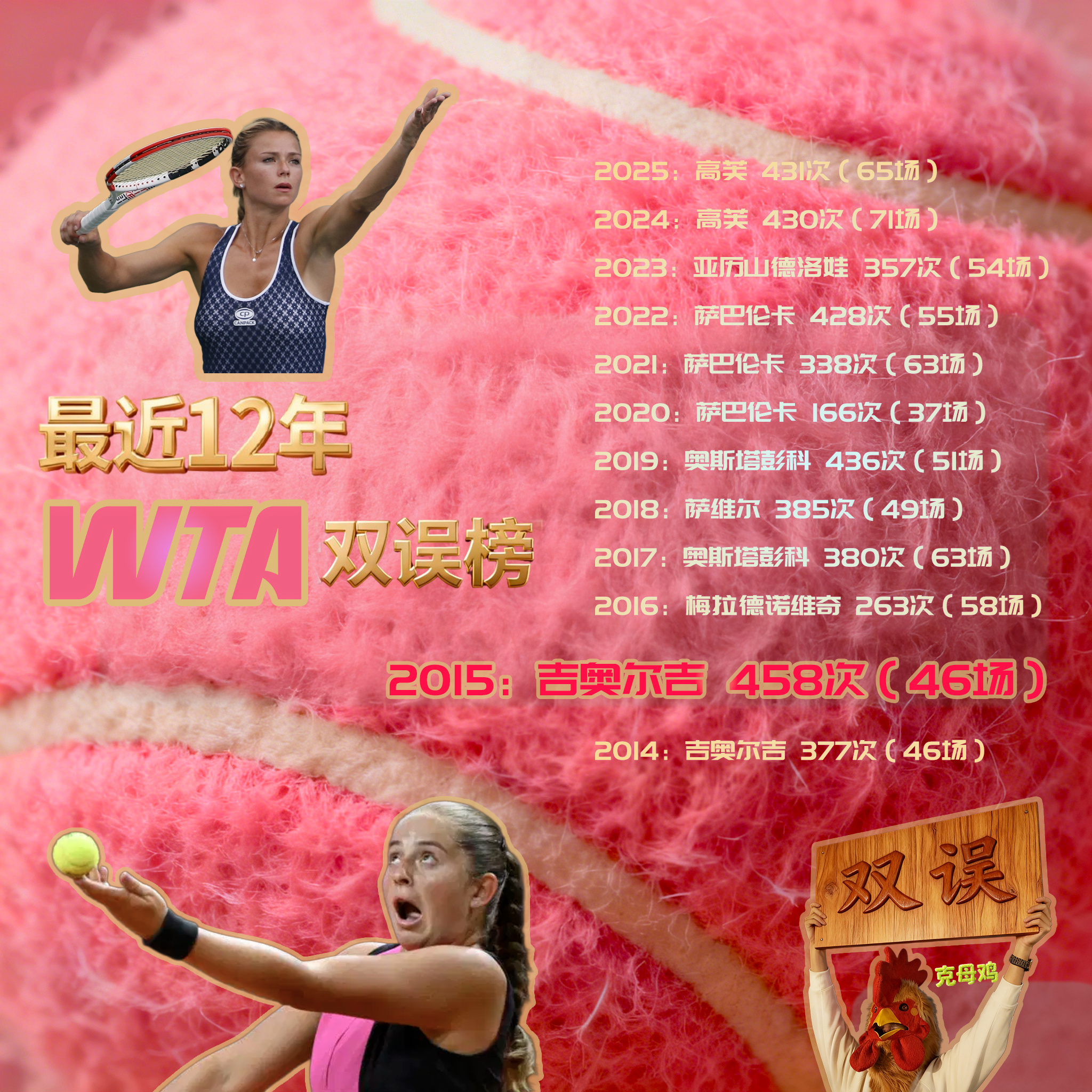 🎾2025网坛年终报告 过去12年女子年度双误榜第一名的选手👁看看高芙明年能不能三连“冠” 并冲击一下吉奥尔吉的纪录2025:高芙 431次(65场)2024:高芙 430次(71场)2023:亚历山德洛娃 357次(54场)2022:萨巴伦卡 428次(55场)2021:萨巴伦卡 338次(63场)2020:萨巴伦卡 166次(37场)2019:奥斯塔彭科 436次(51场)2018:萨维尔 385次(49场)2017:奥斯塔彭科 380次(63场)2016:梅拉德诺维奇 263次(58场)2015:吉奥尔吉 458次(46场)2014:吉奥尔吉 377次(46场)热点解读