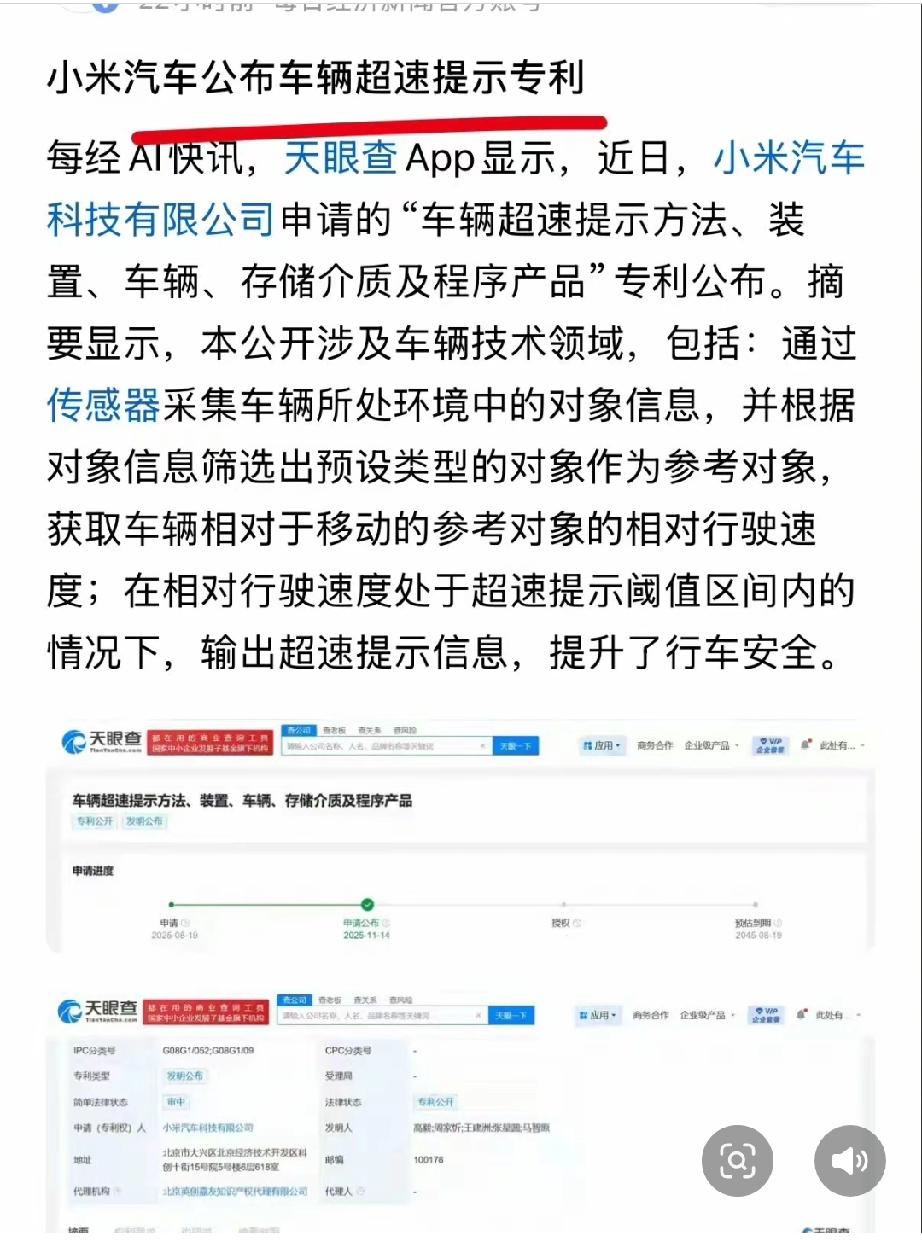 小米汽车申请的“车辆超速提示”专利,被网友吐槽:我10多年前几万块💰的车里面就有这种功能了,咋变成了小米汽车的专利了呢?话说那时候小米公司还没有成立吧? 我可不可以这样理解:以后小米汽车完全可以凭借手中的这项专利向友商或者地图软件公司收钱啦? 大家猜一猜高德百度地图会不会提起反诉?